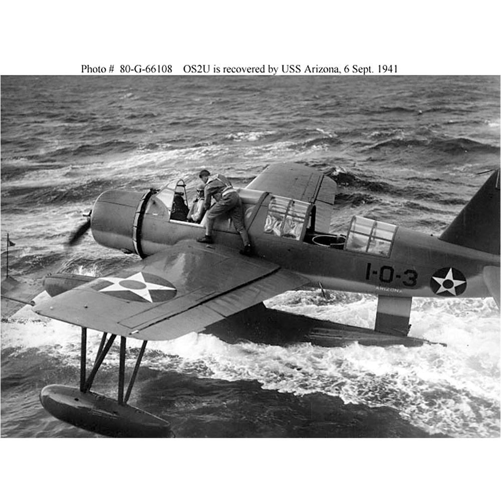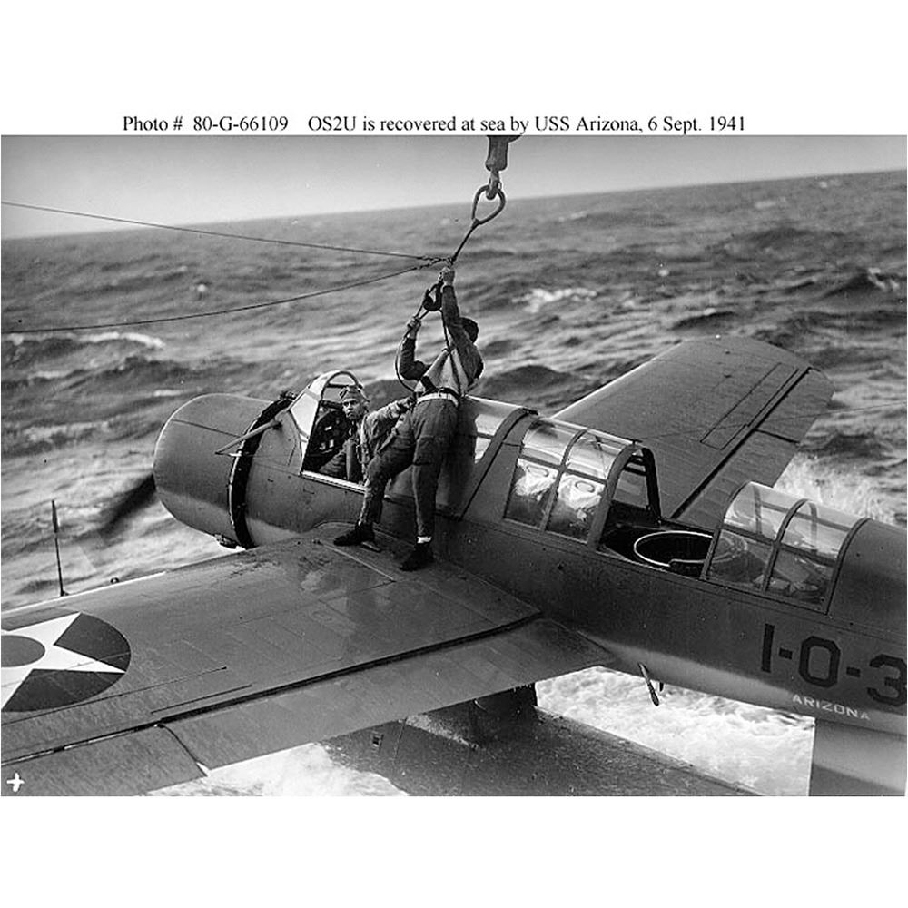 A photo record of Williams in his aircraft exists, and copies of two USNHC archival photographs of USS Arizona floatplane operations off of Hawaii, taken on September 6, 1941 (catalog numbers 80-G-66108 and 80-G-66109) are also included. The photos show Ens. Williams’ aircraft being recovered after landing, and his face is plainly visible in the second picture as he grips his radioman’s belt in an effort to steady him while he attaches the ship’s recovery crane hook.