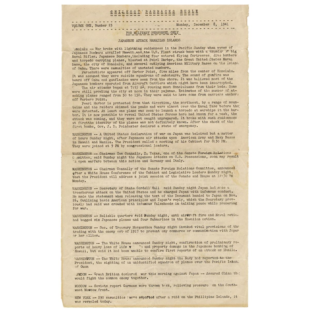 8 December 1941 newsletter informing personnel at Alaska's Chilkoot Barracks of 7 December Pearl Harbor attack. The ''Bugle'' reports in part: ''War broke with lightning suddenness in the Pacific Sunday when waves of Japanese Bombers assailed Hawaii... It is now possible to reveal United States forces here had known for a week, the attack was coming...'' -- an intriguing statement still being debated by historians. Typed mimeographed two page newsletter measures 8'' x 13''. Moderate toning and fading, else very good condition.
