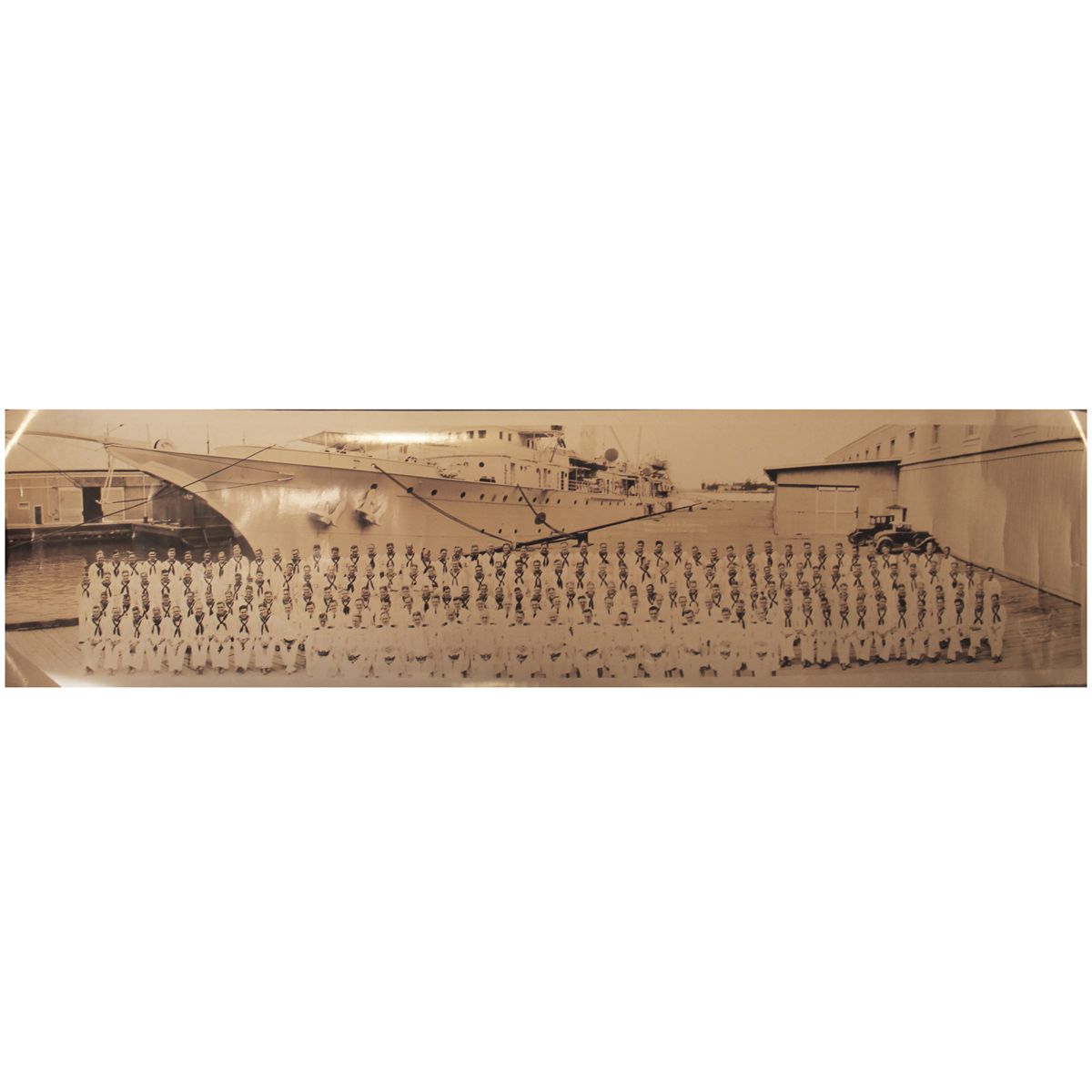 Panoramic photo of submarine tender U.S.S. Bushnell and crew taken in Honolulu 4 June 1932. Commissioned in 1915, the Bushnell saw duty in World War I. Renamed U.S.S. Sumner in 1941, the ship was active in defending Pearl Harbor from the Japanese. 10'' x 40'' photo identified in white ink:: ''Personnel U.S.S. Bushnell. / Honolulu, T.H. June. 4th 1932.'' Photographer (Goldback of San Antonio) backstamp on verso. Moderate chipping, soiling and creasing. Overall very good condition.