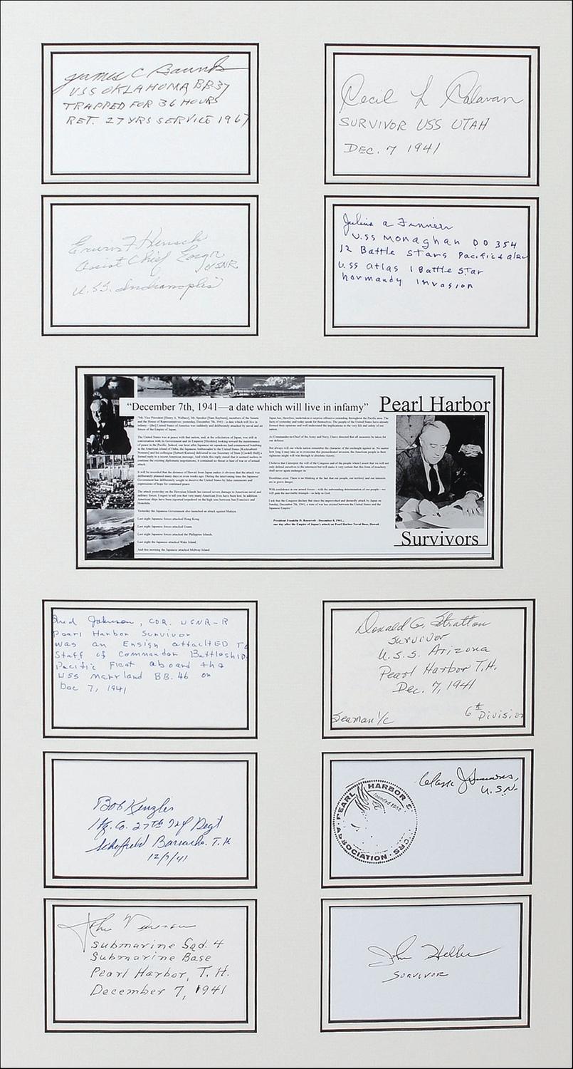 Ink and felt tip signatures of 10 Pearl Harbor survivors on individual white 5 x 3 cards. Signers are: James Bounds, Fred Johnson, Julius Finnern, Donald Stratton, Cecil Calavan, Bob Kinzler, John Newnam, John Heller, Clark J. Simmons, and Erwin Hensch. A few of the men have added their rank, ship assignment, or the date of the attack. Double-matted, with a narrative of FDR’s comments the day after the bombing, to an overall size of 13 x 24. In fine condition.