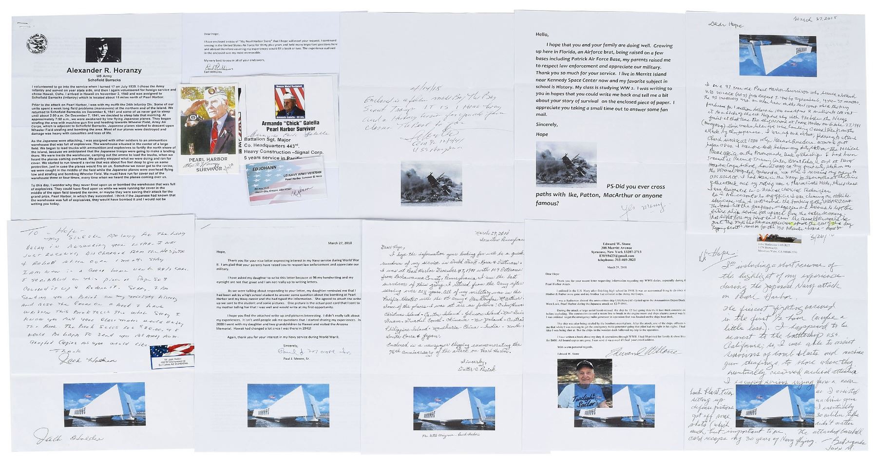 Scarce collection of 13 items signed by survivors of the attack on Pearl Harbor on December 7, 1941, consisting mostly of ALSs, including: Louis Conter; Armando ‘Chick’ Galella (info sheet); Jack Holder; Alex Horanzy (SP and bio sheet); Ed Johann (business card); Ralph Laedtke; John Mathrusse; Paul Moore (with included bio sheet); Walter Pasiak; Edward Stone; and Earl Williams. In overall fine to very fine condition. Accompanied by the original mailing envelopes and other related ephemera and information packets.