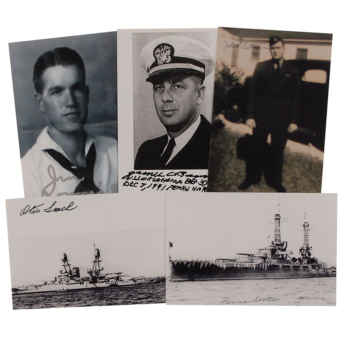 Five glossy photos, 4 x 6 and 6 x 4, each signed in ink by a Pearl Harbor survivor. Signers are: Frank Stowell, James Downing, John Entenmann, James Bounds, and Otis Leach. In overall fine condition.