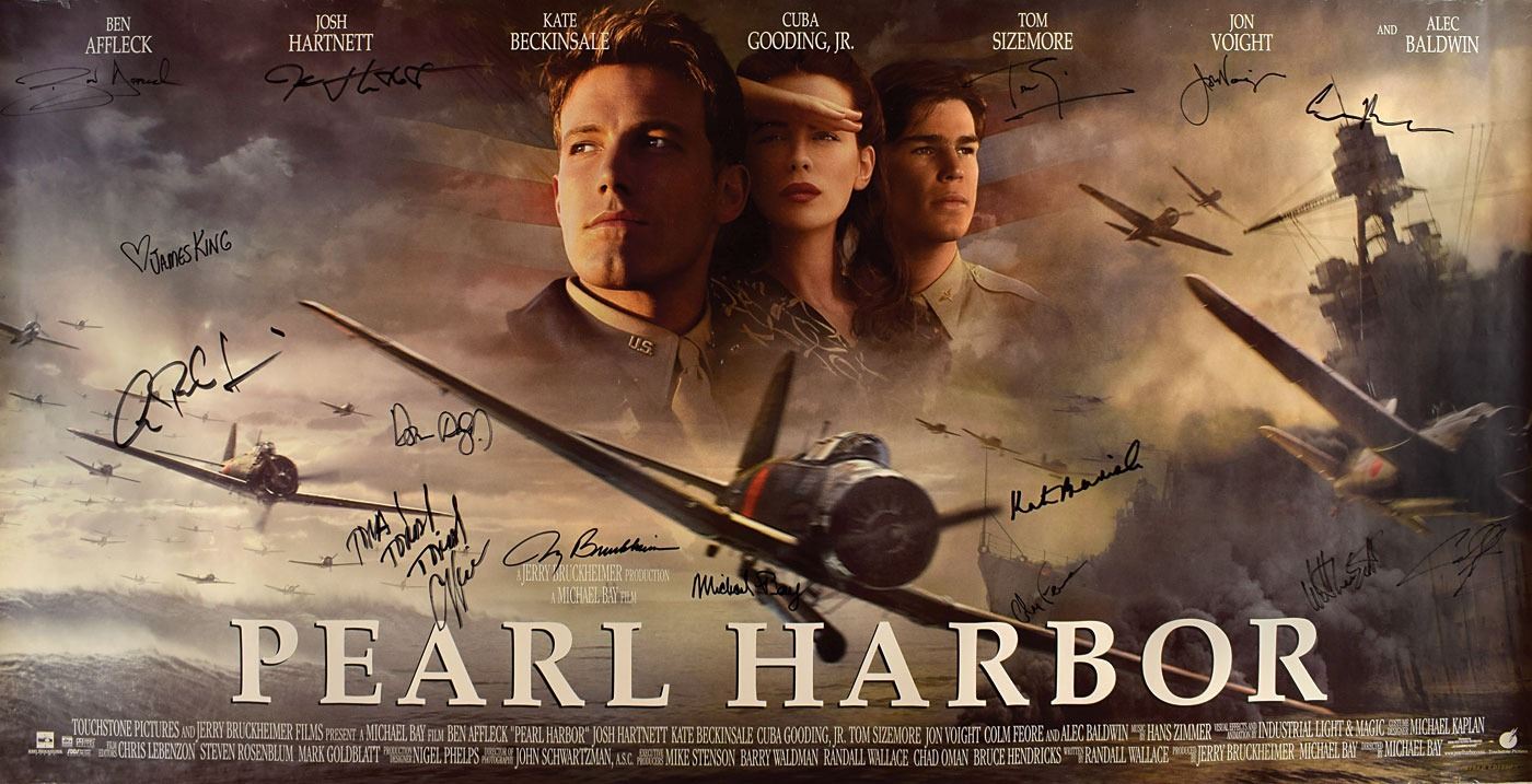 (Touchstone, 2001) Original color 29 x 60 banner movie poster for the 2001 romantic war drama Pearl Harbor, signed in black felt tip by the principal cast and crew: Ben Affleck, Kate Beckinsale, Cuba Gooding, Jr., Dan Aykroyd, Alec Baldwin, Josh Hartnett, Jon Voight, Michael Bay, Jerry Bruckheimer, Tom Sizemore, Cary-Hiroyuki Tagawa, Jaime King, William Lee Scott, Colm Feore, and Ewen Bremner. Rolled and in fine condition, with scattered light creasing.