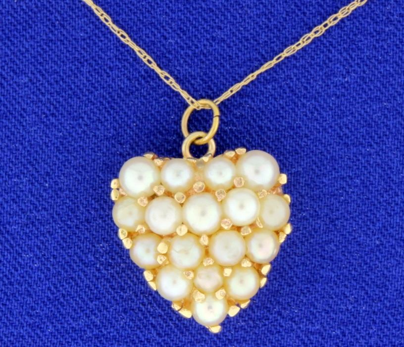 Lovely 14k yellow gold heart shaped pendant covered in 17 cultured pearls! The pearls measure between 2.5mm and 4mm. The pendant measures 3/4" and the chain is also 14k yellow gold and 18" long. 5.6g