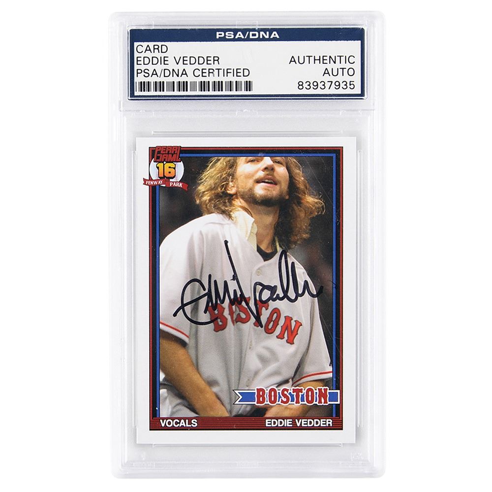 Desirable 2016 Pearl Jam Fenway Park trading card featuring frontman Eddie Vedder in a Boston Red Sox jersey, signed in black felt tip. In very fine condition. Encapsulated in a PSA/DNA authentication holder.