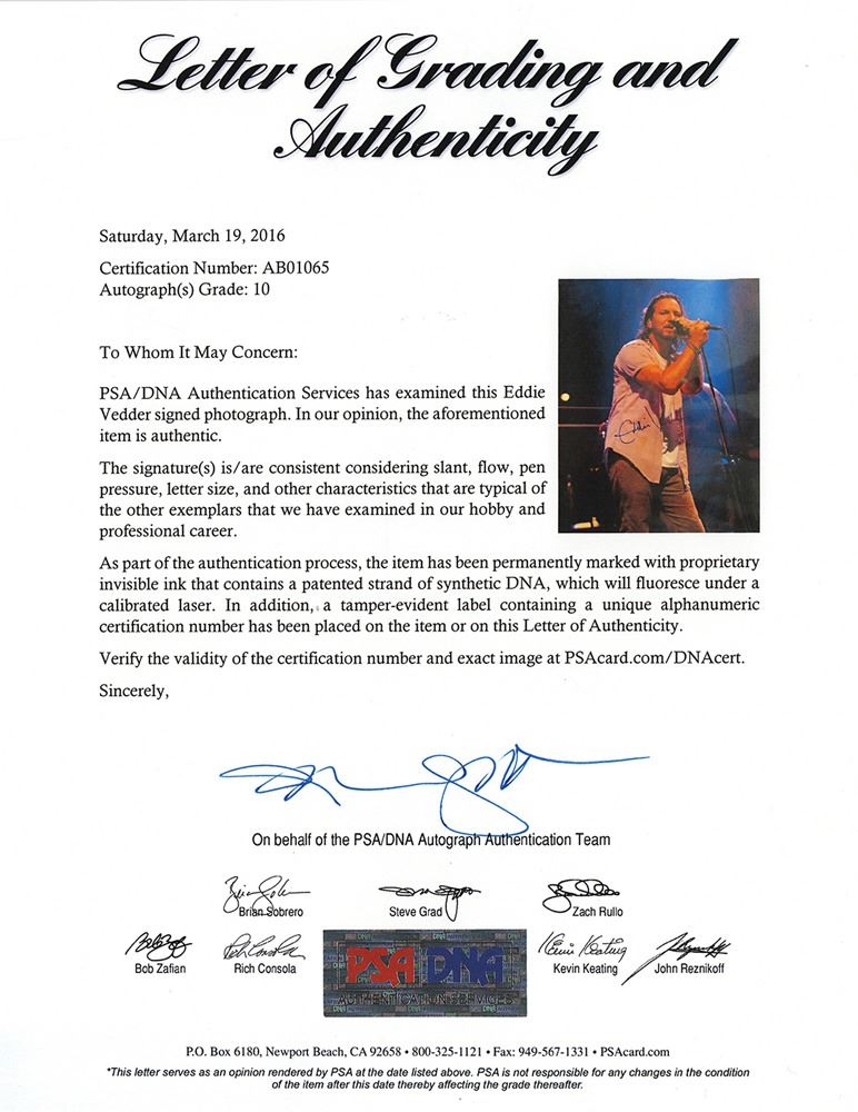 Color glossy 11 x 14 photo of Eddie Vedder singing into a microphone during a Pearl Jam concert, signed in blue felt tip. In very fine condition, with a PSA/DNA label affixed to the lower right corner. Accompanied by a full letter of authenticity from PSA/DNA, which gives the autograph a perfect grade of "10."