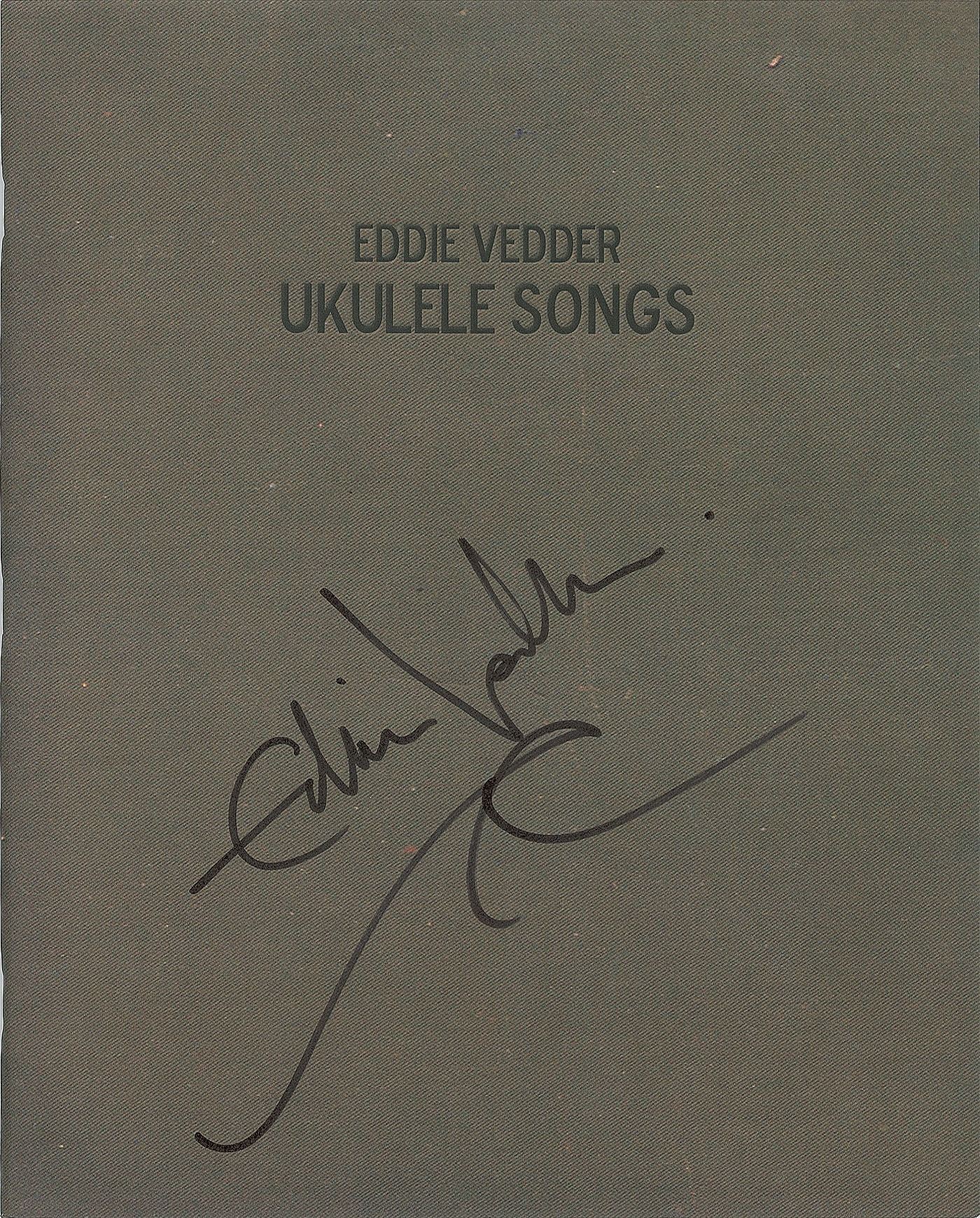 Very desirable lyric and ukulele chord booklet for Ukulele Songs, the second solo album from Eddie Vedder, 9.25 x 11.5, numbered on the back cover, "23," and signed on the front cover in black felt tip by Vedder. In fine condition.