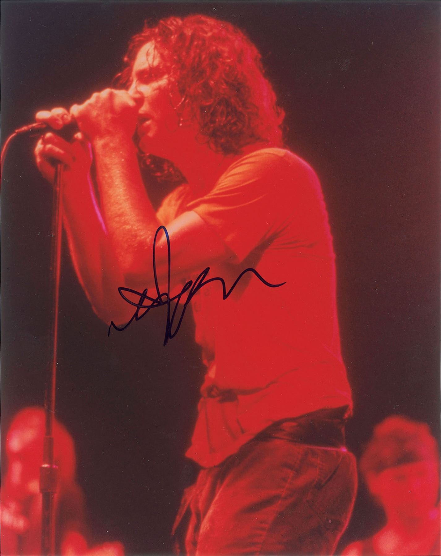 Color glossy 11 x 13.75 photo of the Pearl Jam singer bathed in red light during a performance, signed in blue felt tip by Vedder. In fine condition.