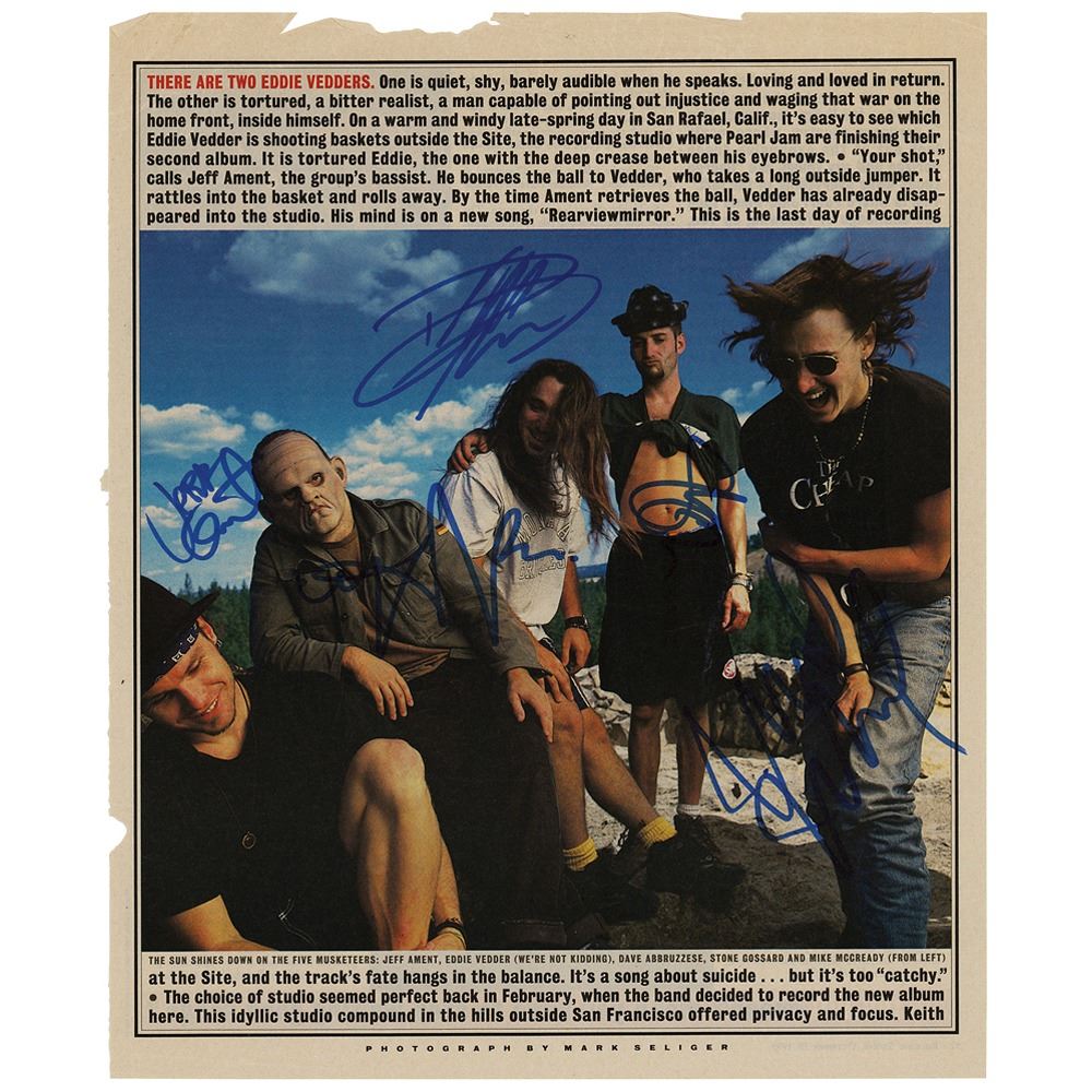 Color 9.75 x 12 magazine page removed from the October 28, 1993, issue of Rolling Stone, which features a great photo of Pearl Jam by Mark Seliger, signed in blue felt tip by Eddie Vedder, Mike McCready, Stone Gossard, Jeff Ament, and Dave Abbruzzese. In very good to fine condition, with light creasing, and some minor edge loss.