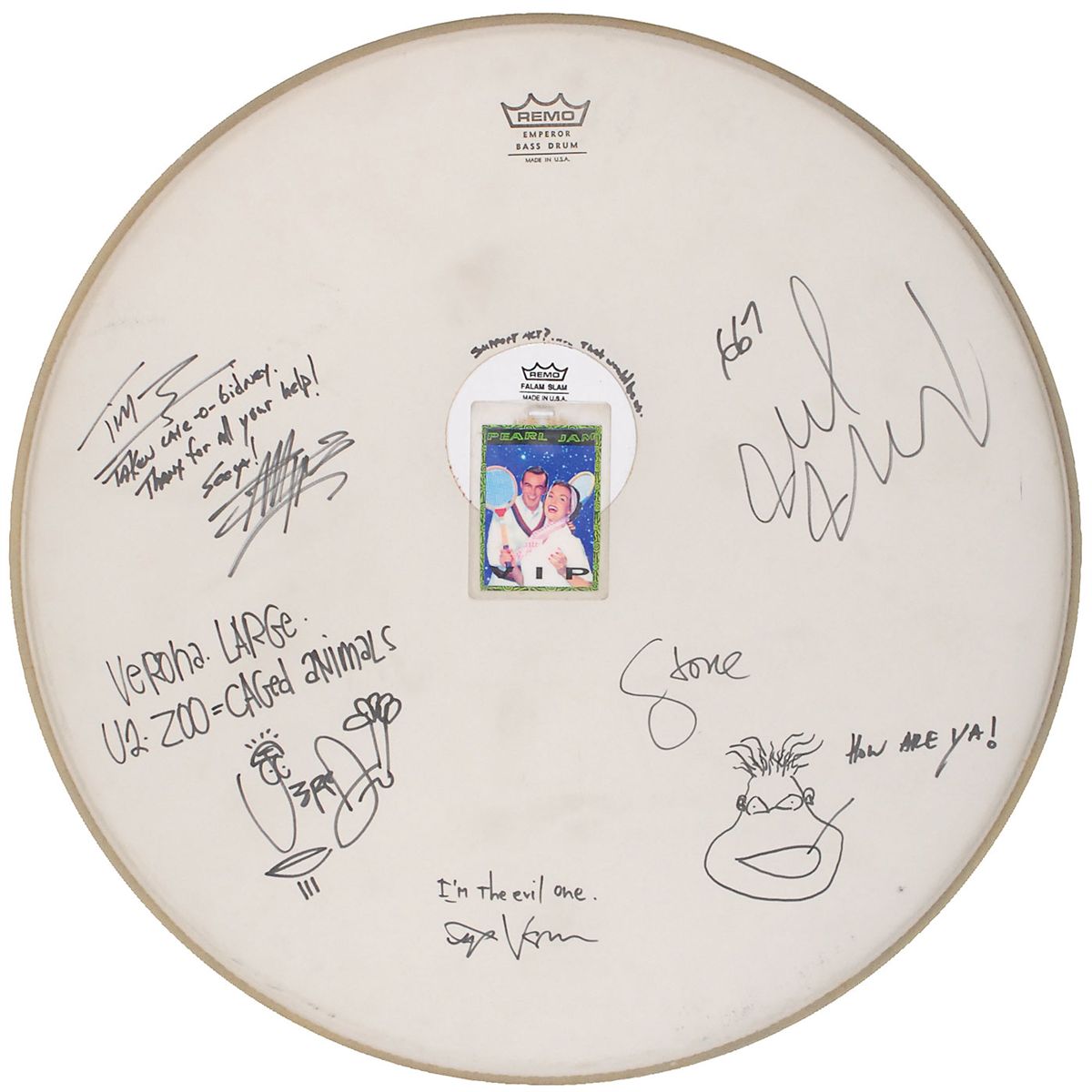 Unused coated Remo 22? bass drum head, signed and inscribed in black felt tip, “Tom, taken care-o-Bidney. Thanx for all your help! See Ya, Dave Abbruzzese,” “Verona Large U2-Zoo=Caged animals, Jeff Ament,” incorporating a sketch into his signature, “I’m the evil one, Eddie Veder,” “Stone,” adding a sketch under his signature,” and “Mike McCready,” with one band member adding, “Support act?…That would be us.” A Pearl Jam laminated backstage pass is affixed to the center of the drumhead. In fine condition. All the signatures were obtained backstage by a crew member at their July 2, 1993, show at the Stadio Bentegodi in Verona, Italy, while opening for U2 on their Zoo TV tour.