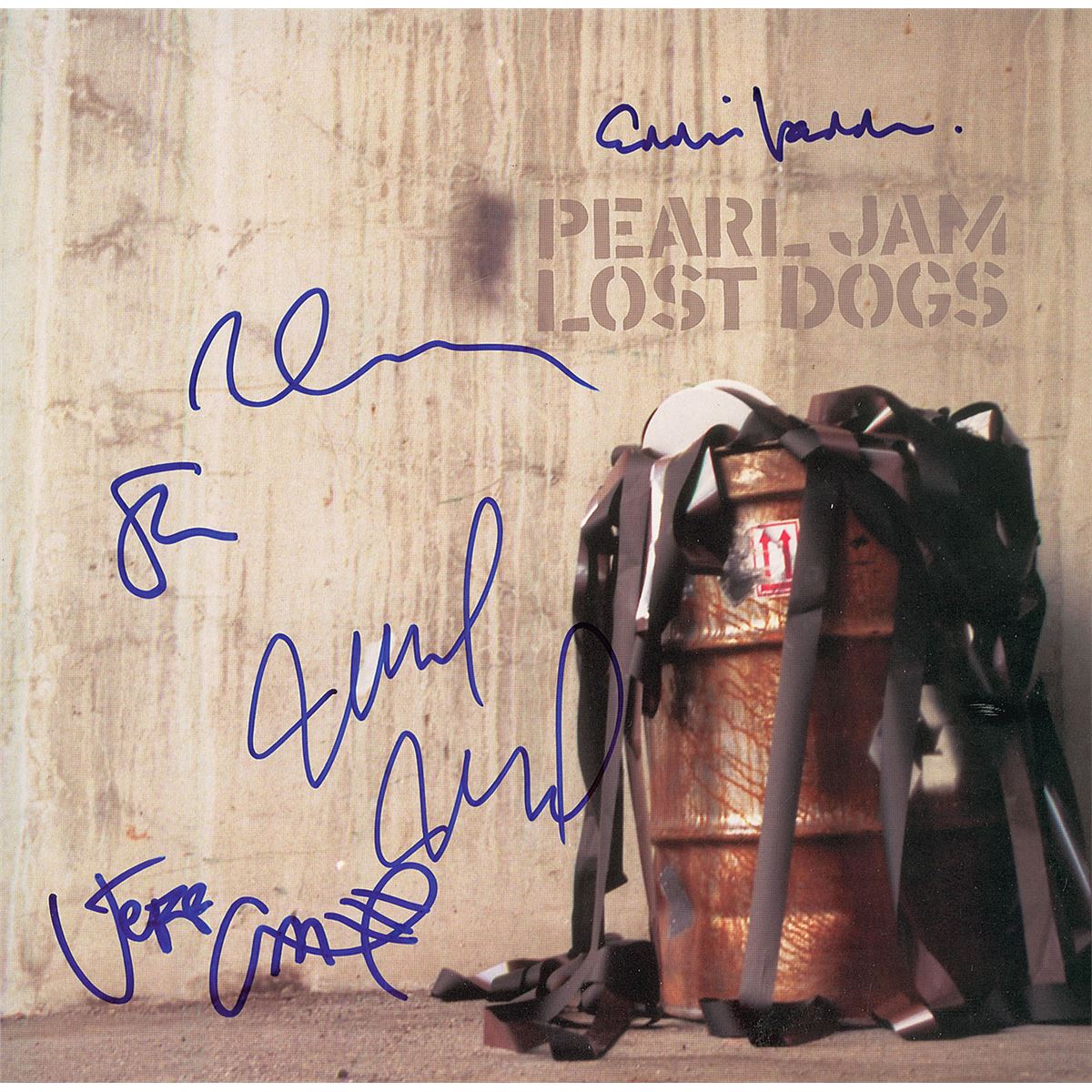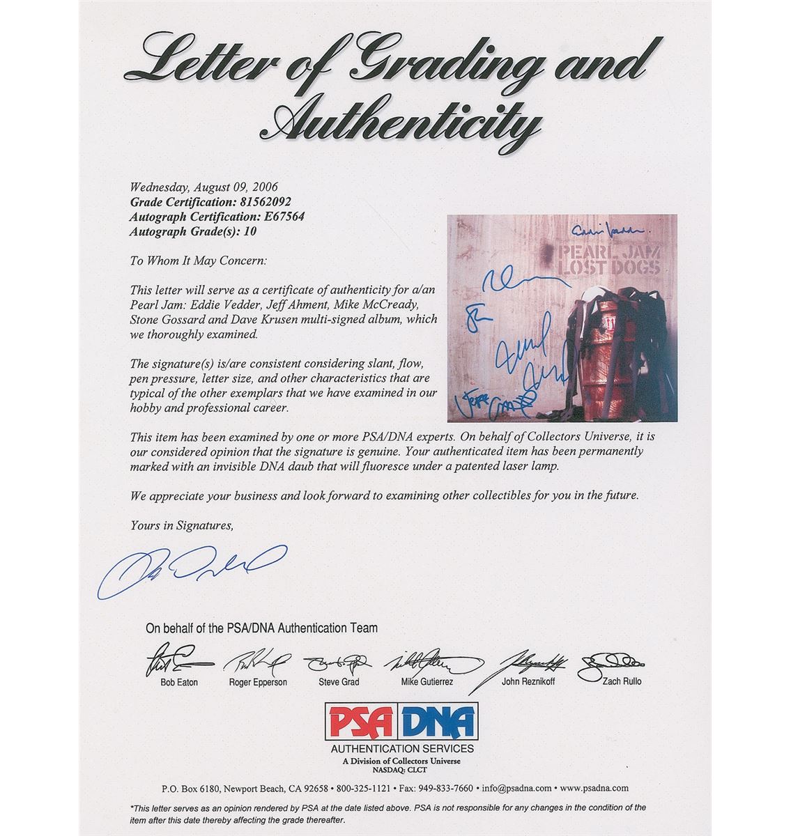 Lost Dogs album signed on the front cover in blue felt tip by Eddie Vedder, Mike McCready, Stone Gossard, Jeff Ament, and Matt Cameron. In fine condition. The record is included. Accompanied by a full letter of grading and authenticity from PSA/DNA.