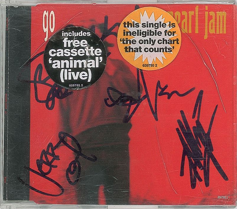 CD single for 'Go' by Pearl Jam, signed on the front of the insert in blue felt tip by Eddie Vedder, Mike McCready, Stone Gossard, Jeff Ament, and Dave Abbruzzese. In fine condition, with a cracked jewel case. The CD is included.