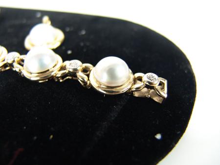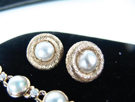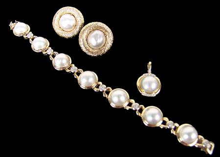 Circa Early 2000s, Natural pearl set, the bracelet with seven pearls  and one each on the earrings and pendant.  Gold  clad sterling.  Very good condition. 8" long    From the Towne Collection.