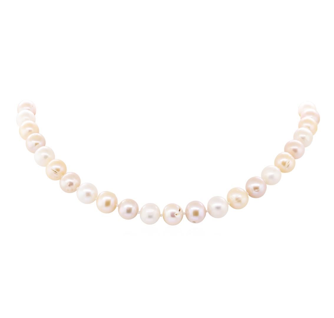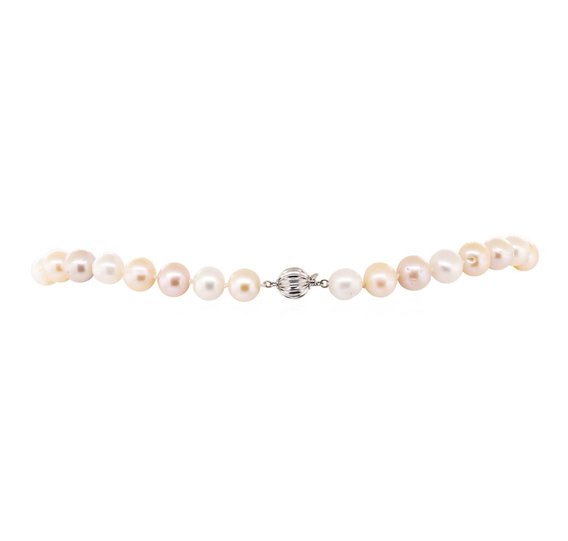One pearl necklace with a corrugated ball clasp featuring: 14KT white gold weighing 1.5 grams with a total weight of 71.6 grams. The pearls are offround freshwater pearls and measure from 12.0 to 10.0 millimeters in diameter. The pearls range in color from cream to very light orangy cream. The necklace measures approximately eighteen and a half inches in length.