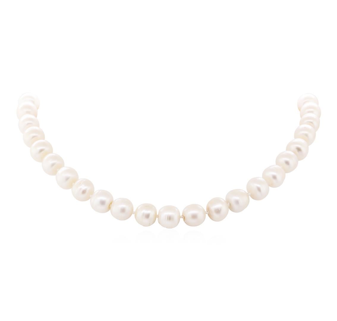 One pearl necklace with a corrugated ball clasp featuring: 14KT yellow gold weighing 1.5 grams with a total weight of 86.1 grams. The pearls are offround freshwater pearls and measure from 12.5 to 11.5 millimeters in diameter. The pearls are freshwater pe