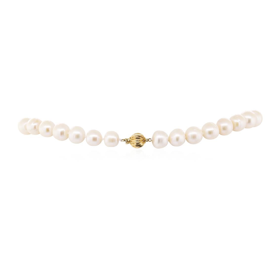 One pearl necklace with a corrugated ball clasp featuring: 14KT yellow gold weighing 1.5 grams with a total weight of 83.1 grams. The pearls are offround freshwater pearls and measure from 12.5 to 11.0 millimeters in diameter. The pearls are freshwater pearls that are cream in color with a light rose overtone. The necklace measures approximately eighteen and a half inches in length.