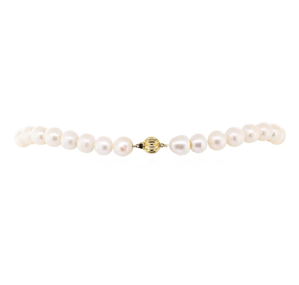 One pearl necklace with a corrugated ball clasp featuring: 14KT yellow gold weighing 1.5 grams with a total weight of 86.1 grams. The pearls are offround freshwater pearls and measure from 12.5 to 11.5 millimeters in diameter. The pearls are freshwater pearls that are cream in color with a light rose overtone. The necklace measures approximately eighteen and a half inches in length.