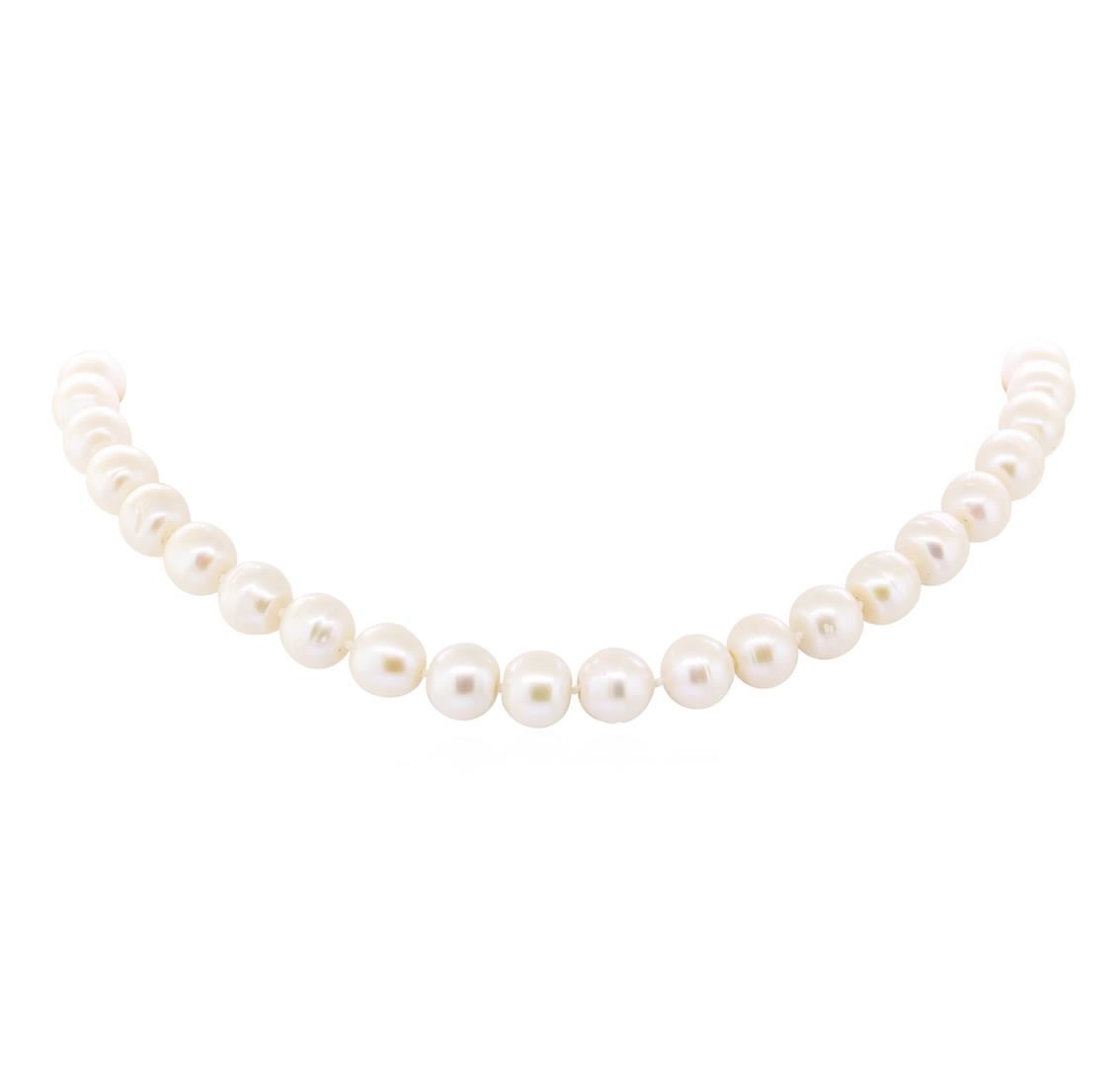 One pearl necklace with a corrugated ball clasp featuring: 14KT yellow gold weighing 1.5 grams with a total weight of 83.1 grams. The pearls are offround freshwater pearls and measure from 12.5 to 11.0 millimeters in diameter. The pearls are freshwater pearls that are cream in color with a light rose overtone. The necklace measures approximately eighteen and a half inches in length.