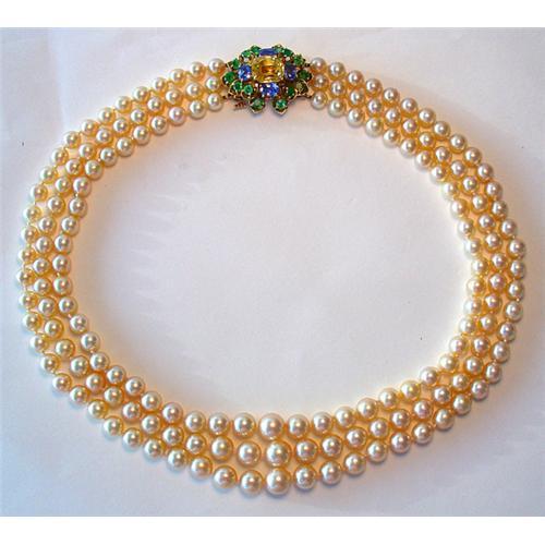 The necklace consists of 167 graduated (6.5mm-9mm) super clean natural gold color cultured pearls with high luster and an 18Kt gold detachable clasp set with emeralds and blue and yellow sapphires. It is probably from the 1950s. The lenghts of the three strands are 40 cm, 43 cm, 47 cm (15.75", 17", 18.5"). The clasp measures approximately 1.25"x1" (3x2 cm).The center yellow sapphire measures 9x10.5 mm.