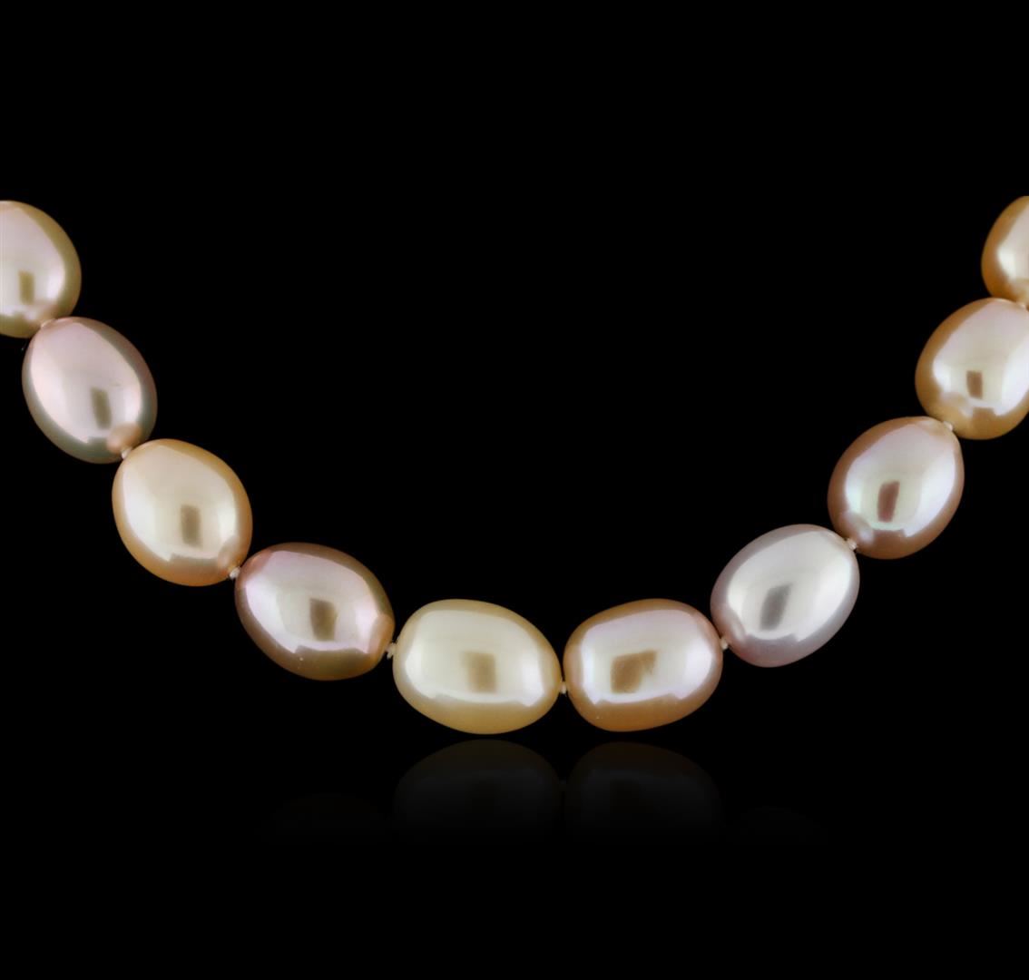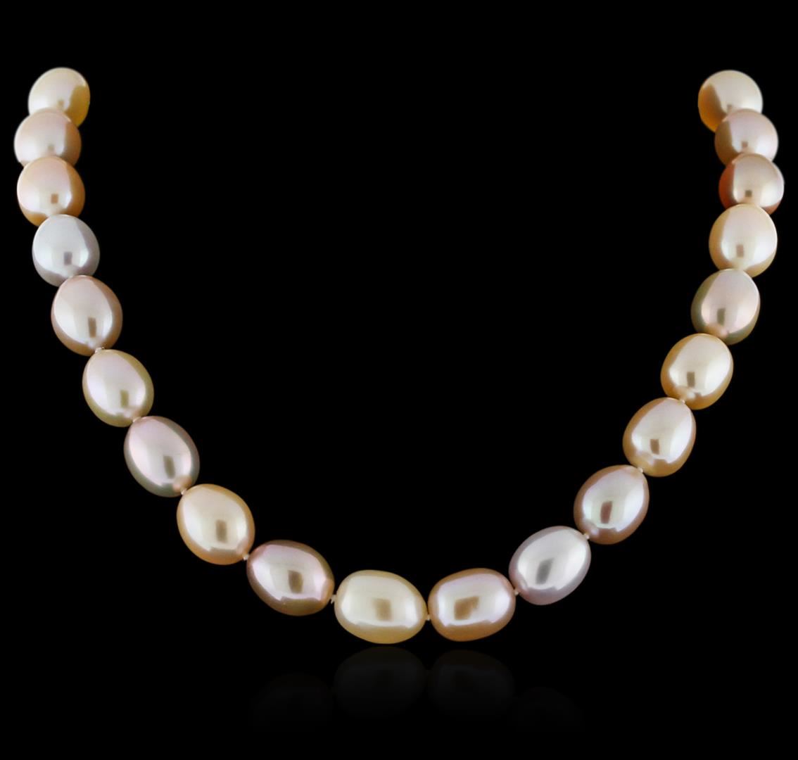One necklace featuring: 29 pearls measuring 11-14mm with a silver clasp.