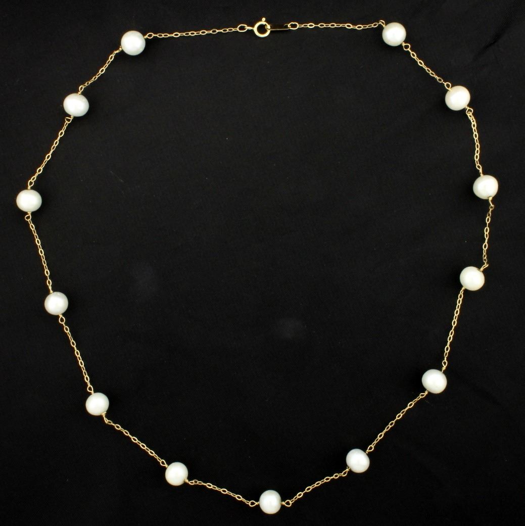 14K yellow gold, it is 18 inches long, with a lobster clasp. This necklace contains 7.2mm pearls. 6.8g