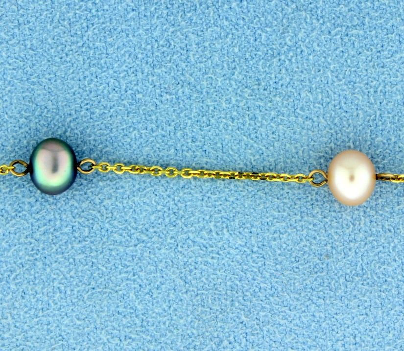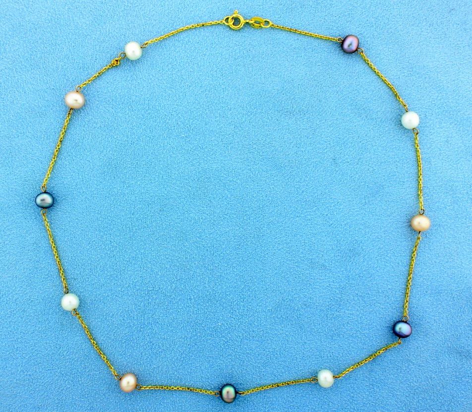 In 14K yellow gold, the necklace is 15 1/2 inches long and contains eleven 6mm white, silver and rose colored pearls. 4.0g