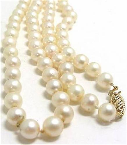 30 inch Cultured Pearl necklace, 6 1/2 mm x 7 mm, light pink in color good luster and quality and finished with a 14 kt yellow gold safety clasp Appraised Replacement Value $3,000.