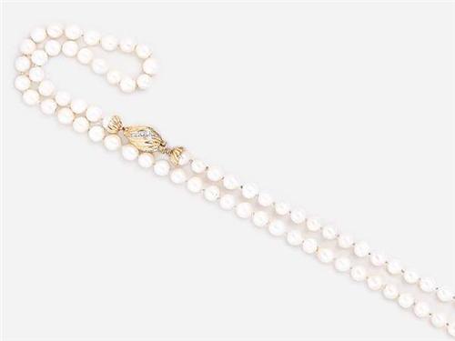 88 cultivated pearls, pearl diameter: 6.5-7.0 mm, 18 K gold clasp with 18 tiny brilliants circa 0.20 ct, gross weight: 48.5 g, length: 70 cm.