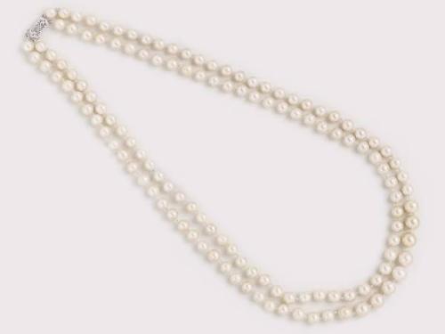 Two rows of cultivated pearls, bigger towards the middle part, pearl diameter: 6.0-7.8 mm, 14 K white gold clasp, gross weight 48.4 g, inside row length: 48 cm.