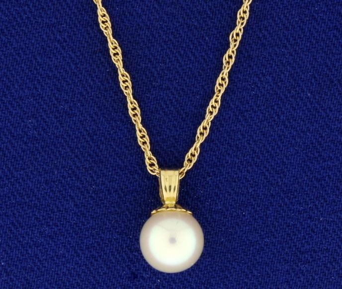 In 14k yellow gold, contains a high quality 6.9mm pearl with excellent color and luster. 1.25 mm thick neck chain. 2.3g.