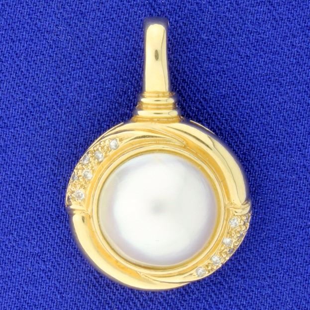 In 14K yellow gold, it is 1 1/4 inches long and has a 13.5mm pearl with fantastic color and luster, as well as fourteen 1/2pt diamonds. Look for matching ring. 5.7g