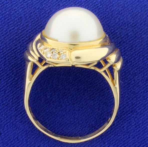 In 14K yellow gold, it contains a 13.9mm pearl with fantastic color and luster and fourteen 1/2pt diamond. Size 10 1/2. Look for matching pendant.            9.4g