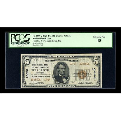 <B>Pearl River, NY</B></I> - $5 1929 Ty. 2 <B>First NB & TC</B></I> Ch. # 10526<BR> This is only the third Type 2 $5 to turn up on this scarce and popular Rockland County location. In fact, less than ten small size altogether have been reported. This bright, lightly circulated piece has been certified by PCGS as <B>Extremely Fine 45</B></I>.<BR><BR><b>Shipping:</b> Coins & Currency (<a target="_blank" href="http://www.heritageauctions.com/common/shipping.php">view shipping information</a>)