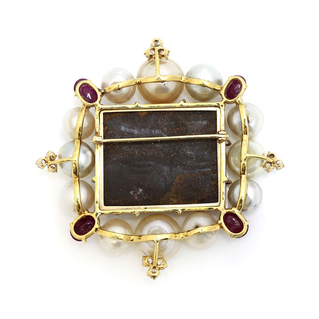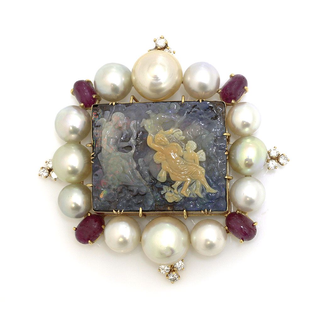 Pearl Ruby Diamond Carved Opal 14k Gold Brooch