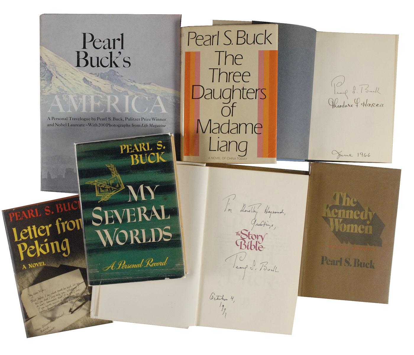 Seven hardcover books, each signed in ink on an opening page by Buck. Titles are: Pearl Buck’s America, Letter from Peking, For Spacious Skies, The Kennedy Women, The Three Daughters of Madame Liang, The Story Bible (ins), and My Several Worlds (ins). In very good to fine condition, with some scattered foxing, damp staining, and wear to dustjackets.