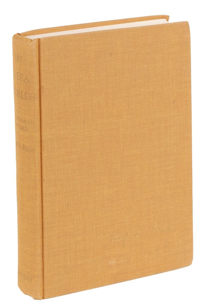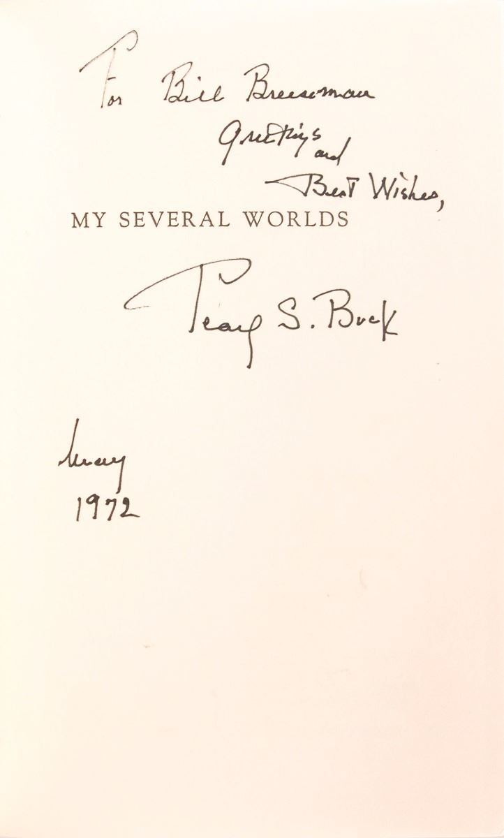 Signed book: My Several Worlds. Later printing. NY: The John Day Company, 1954. Hardcover, 6 x 8.5, 407 pages. Signed and inscribed on the half-title page in black felt tip, “For Bill Breseman, Greetings and Best Wishes, Pearl S. Buck, May 1972.” In fine condition.