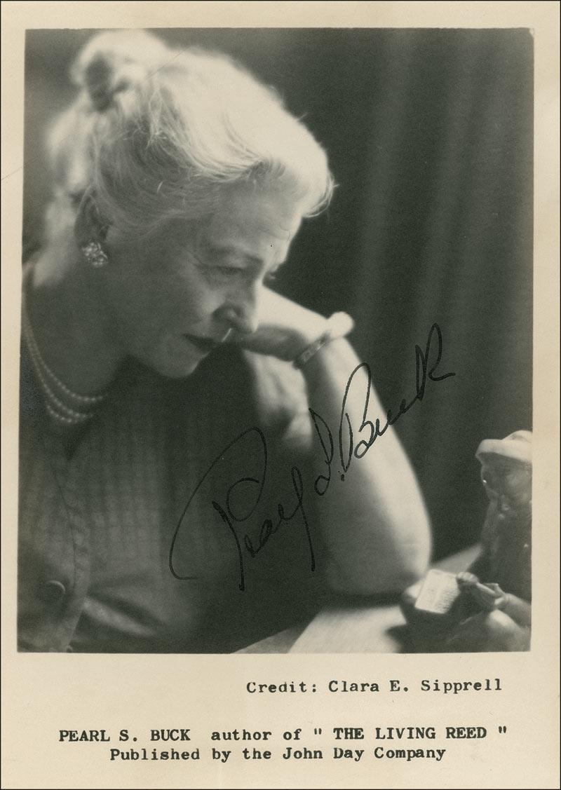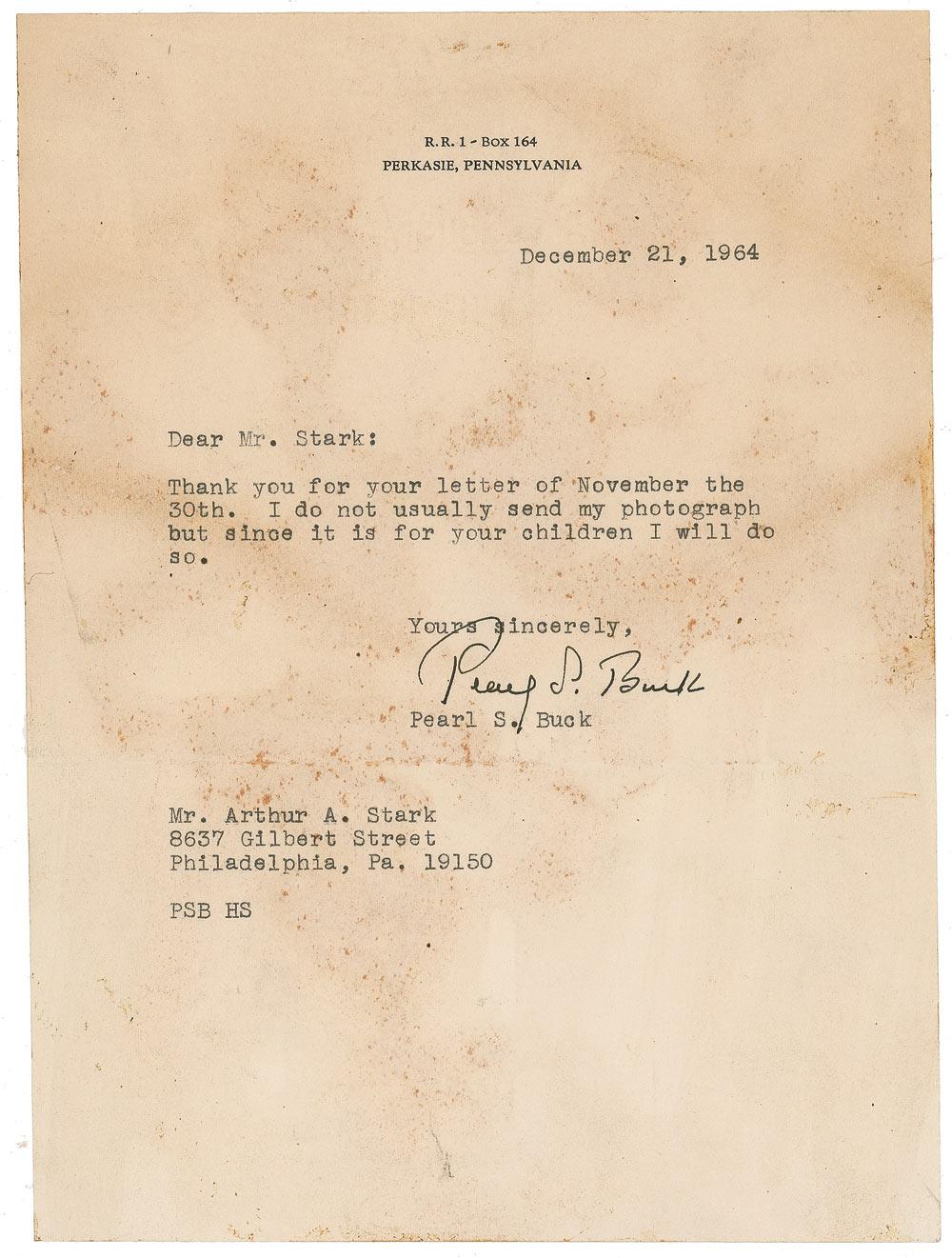Vintage 5 x 7 lightweight photo, signed in black ink; and a one-page TLS, 6.5 x 9, dated December 21, 1964. Letter which accompanied the signed photo reads in part: “I do not usually send my photograph but since it is for your children I will do so.” In very good condition, with a bit of light toning and silvering to photo, and moderate toning and foxing to letter.