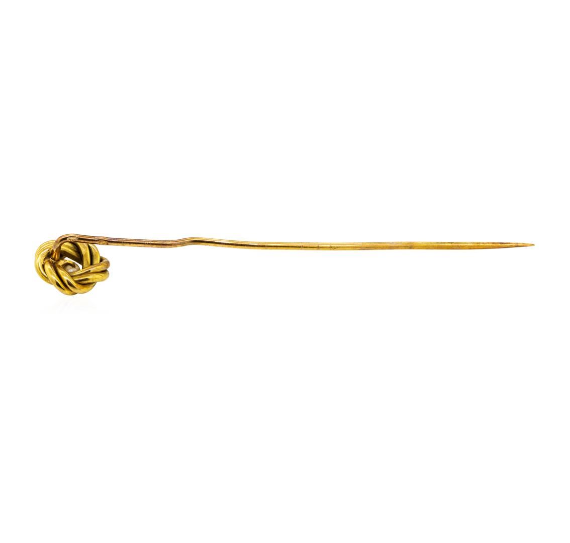 One curved knot stick pin featuring: 14KT yellow gold weighing 2.4 grams containing one seed pearl.