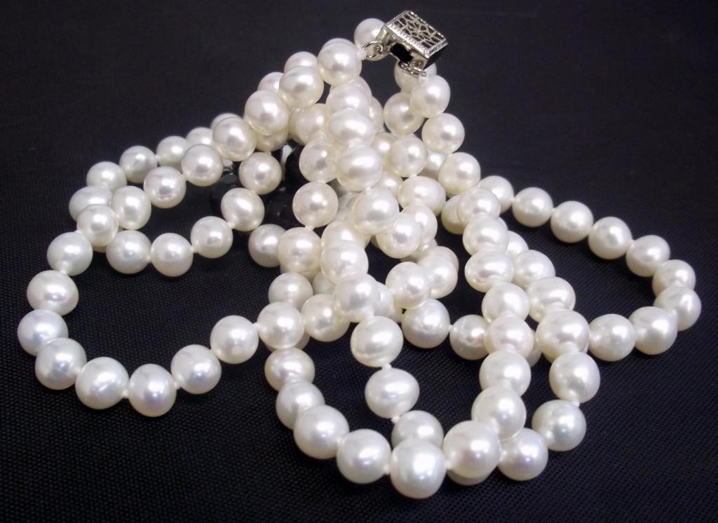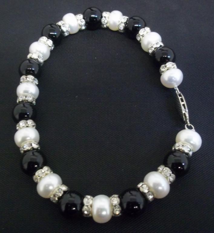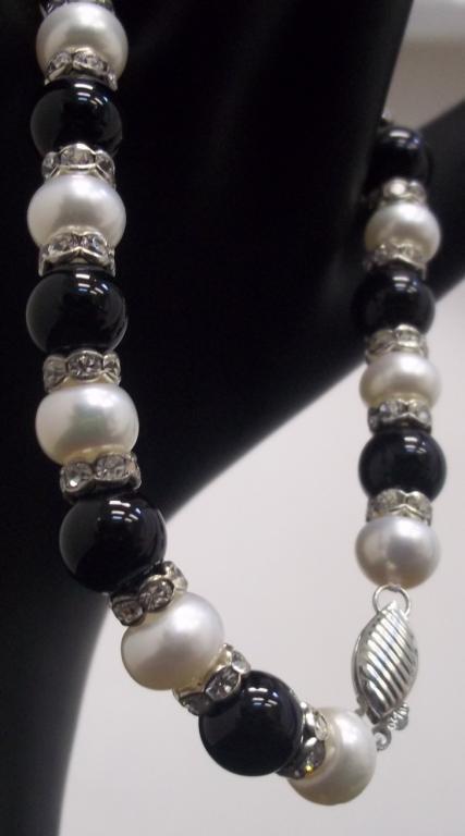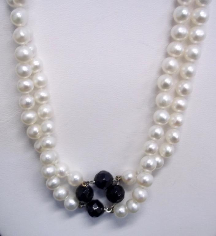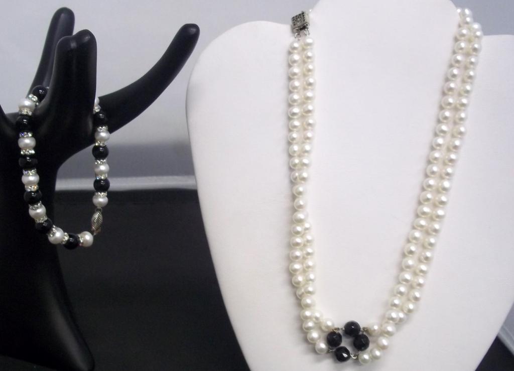 A 7.5" bracelet made with 7mm pearls, black beads and roundells has a retail value of $340-. This double strand necklace is also made with 7mm pearls and is accented with black beads. The retail value is $880-