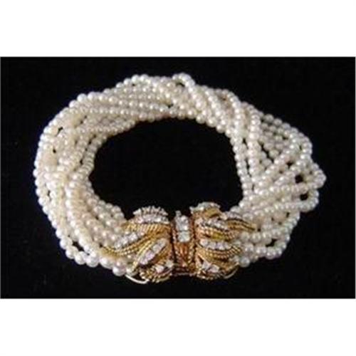 9-Strand Pearl Bracelet. With 18K gold clasp, containing 2.3 carats of fine white flawless full-cut diamonds. Gold tested with 18K acid. Diamonds tested with a diamond tester. Clasp is excellent design, and works perfectly. No imperfections whatsoever.