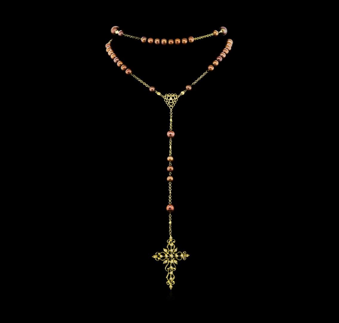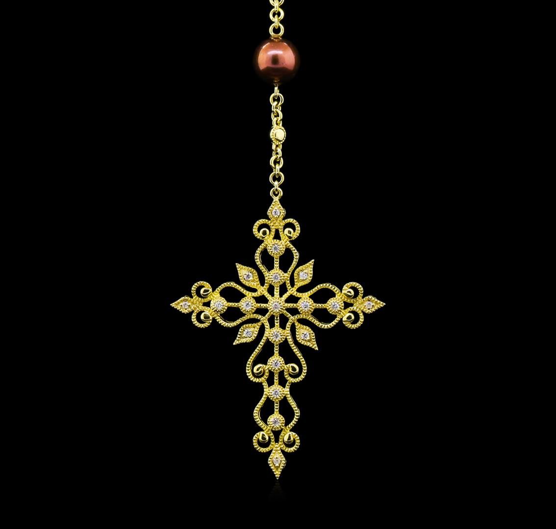 One cross pendant with chain featuring: 14KT yellow gold weighing 13.72 grams containing pearls and diamonds with a total weight of 0.18ct.