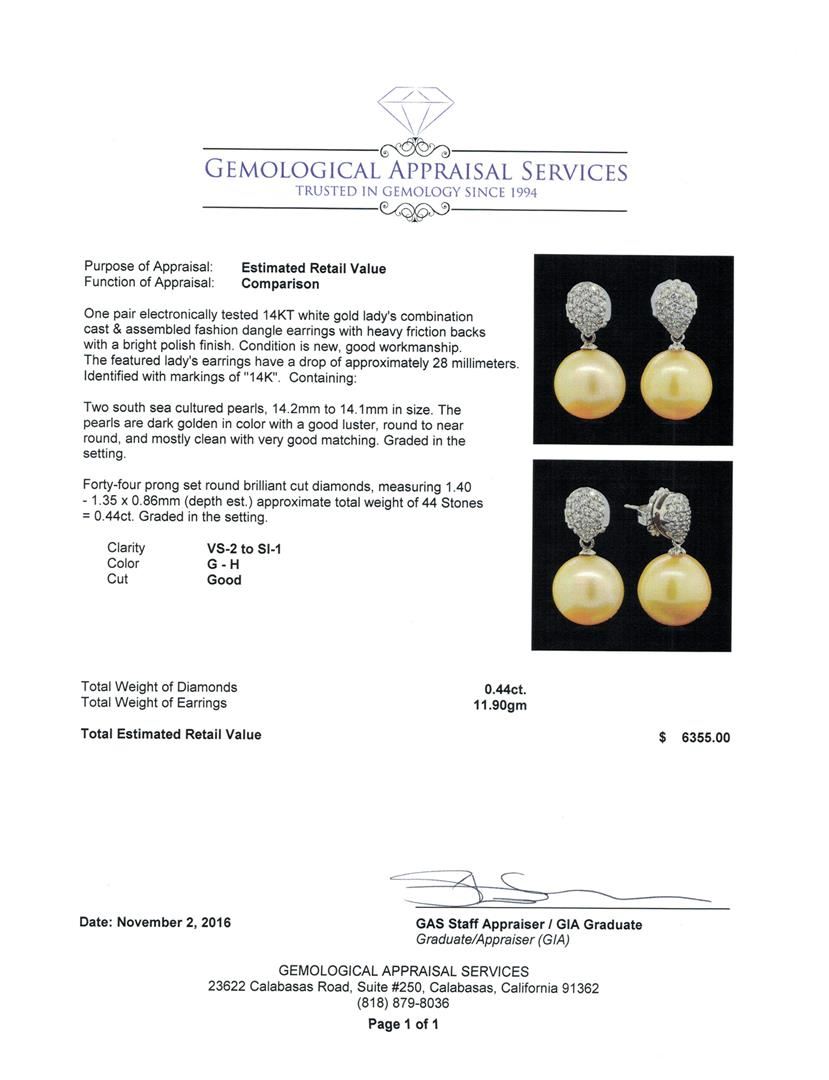 One pair electronically tested 14KT white gold lady's combination cast & assembled fashion dangle earrings with heavy friction backs with a bright polish finish. The featured lady's earrings have a drop of approximately 28 millimeters. Identified with markings of '14K'. Condition is new, good workmanship. Containing: Two south sea cultured pearls, 14.2mm to 14.1mm in size. The pearls are dark golden in color with a good luster, round to near round, and mostly clean with very good matching. Graded in the setting. Forty-Four prong set round brilliant cut diamonds, measuring 1.40 - 1.35 x 0.86mm (depth est.) approximate total weight of 44 Stones = 0.44ct. Graded in the setting. Clarity VS-2 to SI-1. Color: G - H Cut Good. Total Weight of Diamonds 0.44ct.. Total Weight of Earrings 11.90gm. GAS Appraised at $6,355.00.