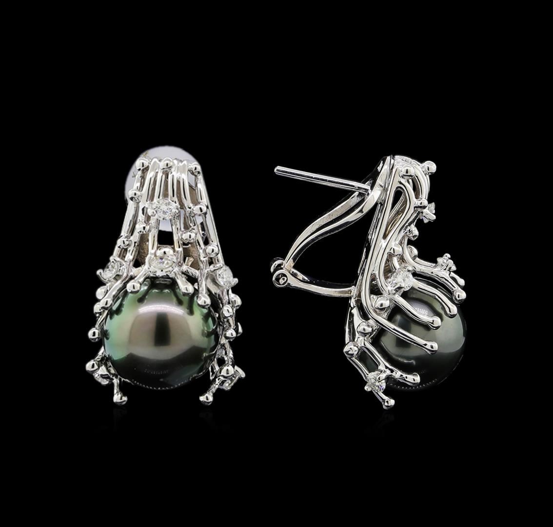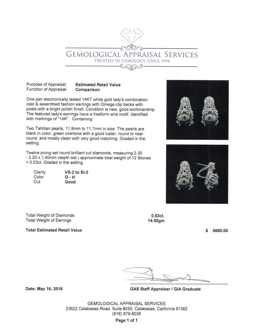One pair electronically tested 14KT white gold lady's combination cast & assembled fashion earrings with Omega clip backs with posts with a bright polish finish. The featured lady's earrings have a freeform wire motif. Identified with markings of '14K'. Condition is new, good workmanship. Containing: Two Tahitian pearls, 11.8mm to 11.7mm in size. The pearls are black in color, green overtone with a good luster, round to near round, and mostly clean with very good matching. Graded in the setting. Twelve prong set round brilliant cut diamonds, measuring 2.30 - 2.20 x 1.40mm (depth est.) approximate total weight of 12 Stones = 0.53ct. Graded in the setting. Clarity VS-2 to SI-2. Color: G - H Cut Good. Total Weight of Diamonds 0.53ct.. Total Weight of Earrings 14.50gm. GAS Appraised at $5,680.00.