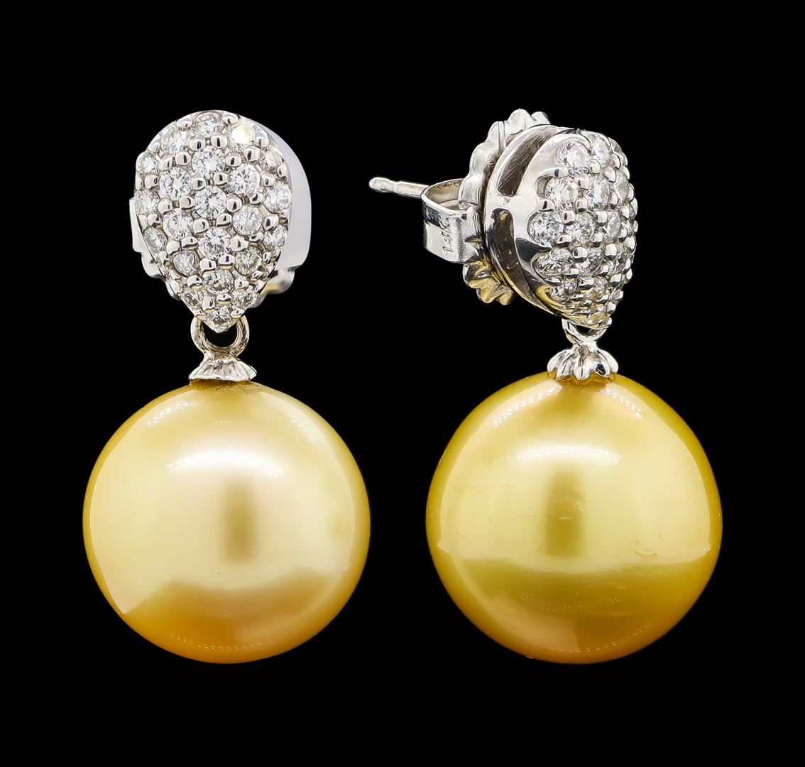 One pair electronically tested 14KT white gold lady's combination cast & assembled fashion dangle earrings with heavy friction backs with a bright polish finish. The featured lady's earrings have a drop of approximately 28 millimeters. Identified with markings of '14K'. Condition is new, good workmanship. Containing: Two south sea cultured pearls, 14.2mm to 14.1mm in size. The pearls are dark golden in color with a good luster, round to near round, and mostly clean with very good matching. Graded in the setting. Forty-Four prong set round brilliant cut diamonds, measuring 1.40 - 1.35 x 0.86mm (depth est.) approximate total weight of 44 Stones = 0.44ct. Graded in the setting. Clarity VS-2 to SI-1. Color: G - H Cut Good. Total Weight of Diamonds 0.44ct.. Total Weight of Earrings 11.90gm. GAS Appraised at $6,355.00.