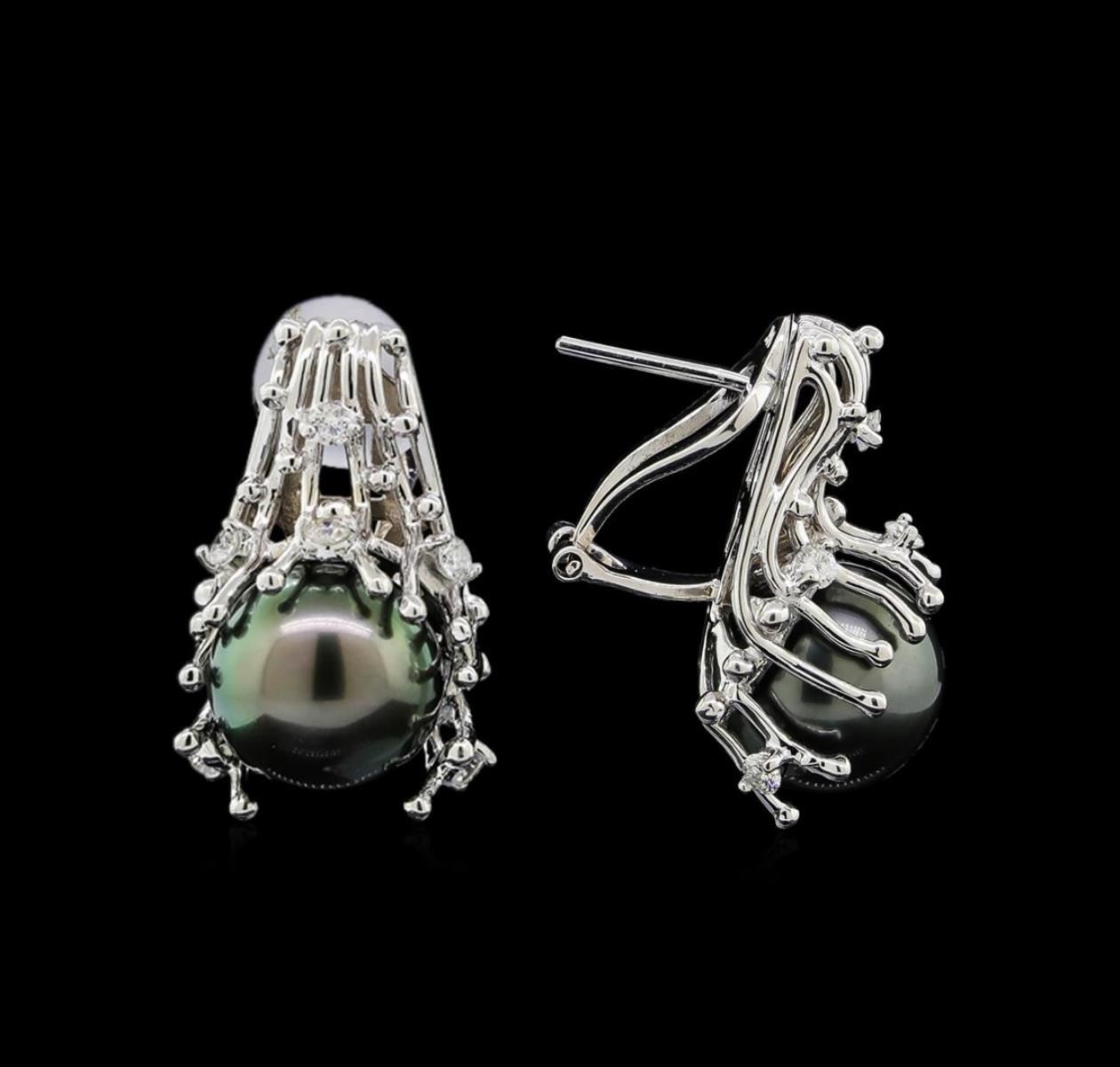 One pair electronically tested 14KT white gold lady's combination cast & assembled fashion earrings with Omega clip backs with posts with a bright polish finish. The featured lady's earrings have a freeform wire motif. Identified with markings of '14K'. Condition is new, good workmanship. Containing: Two Tahitian pearls, 11.8mm to 11.7mm in size. The pearls are black in color, green overtone with a good luster, round to near round, and mostly clean with very good matching. Graded in the setting. Twelve prong set round brilliant cut diamonds, measuring 2.30 - 2.20 x 1.40mm (depth est.) approximate total weight of 12 Stones = 0.53ct. Graded in the setting. Clarity VS-2 to SI-2. Color: G - H Cut Good. Total Weight of Diamonds 0.53ct.. Total Weight of Earrings 14.50gm. GAS Appraised.