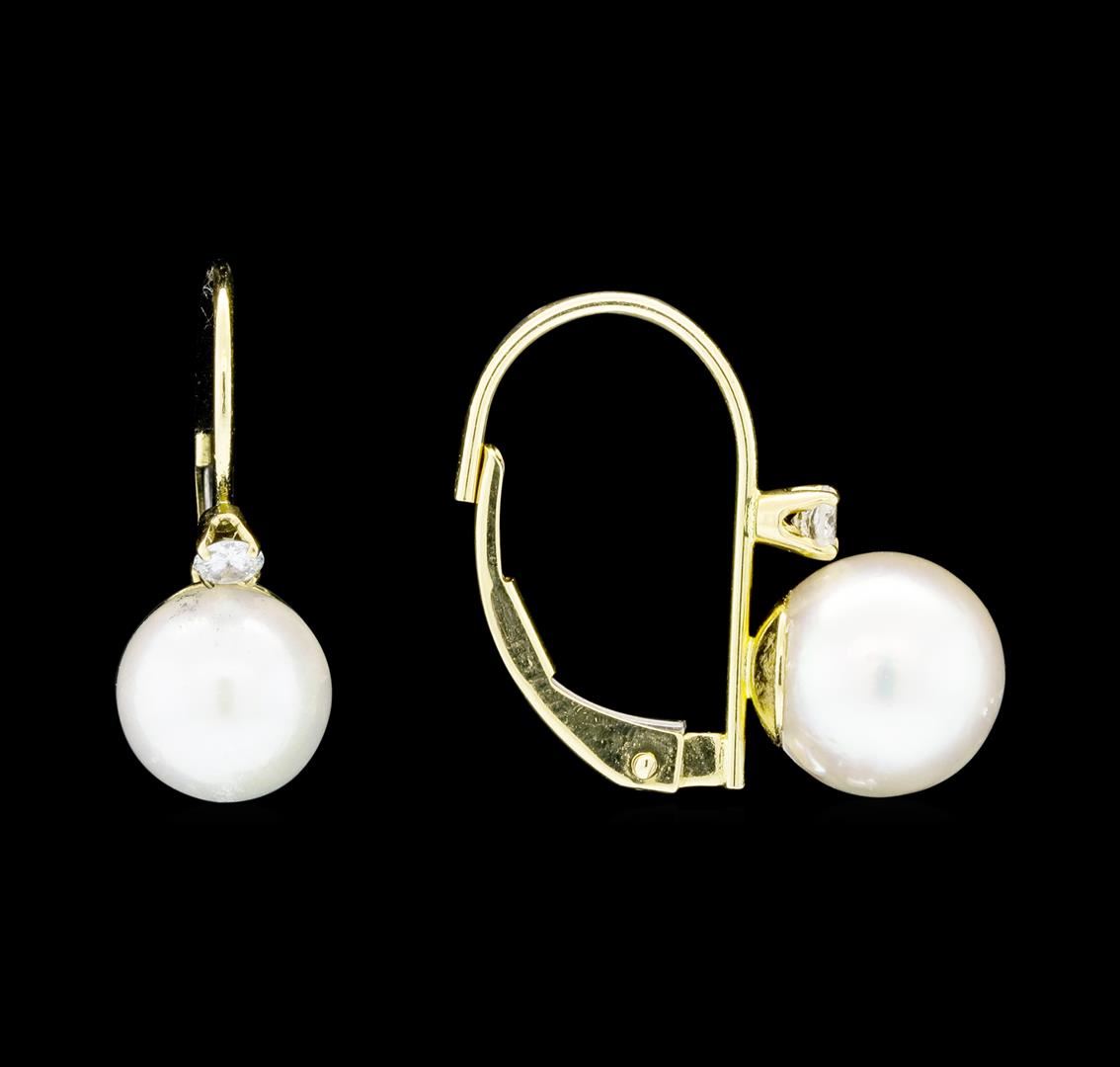 One pair of earrings featuring: 14KT yellow gold weighing 2.35 grams containing two pearls measuring 7mm and diamonds weighing 0.02ctw.