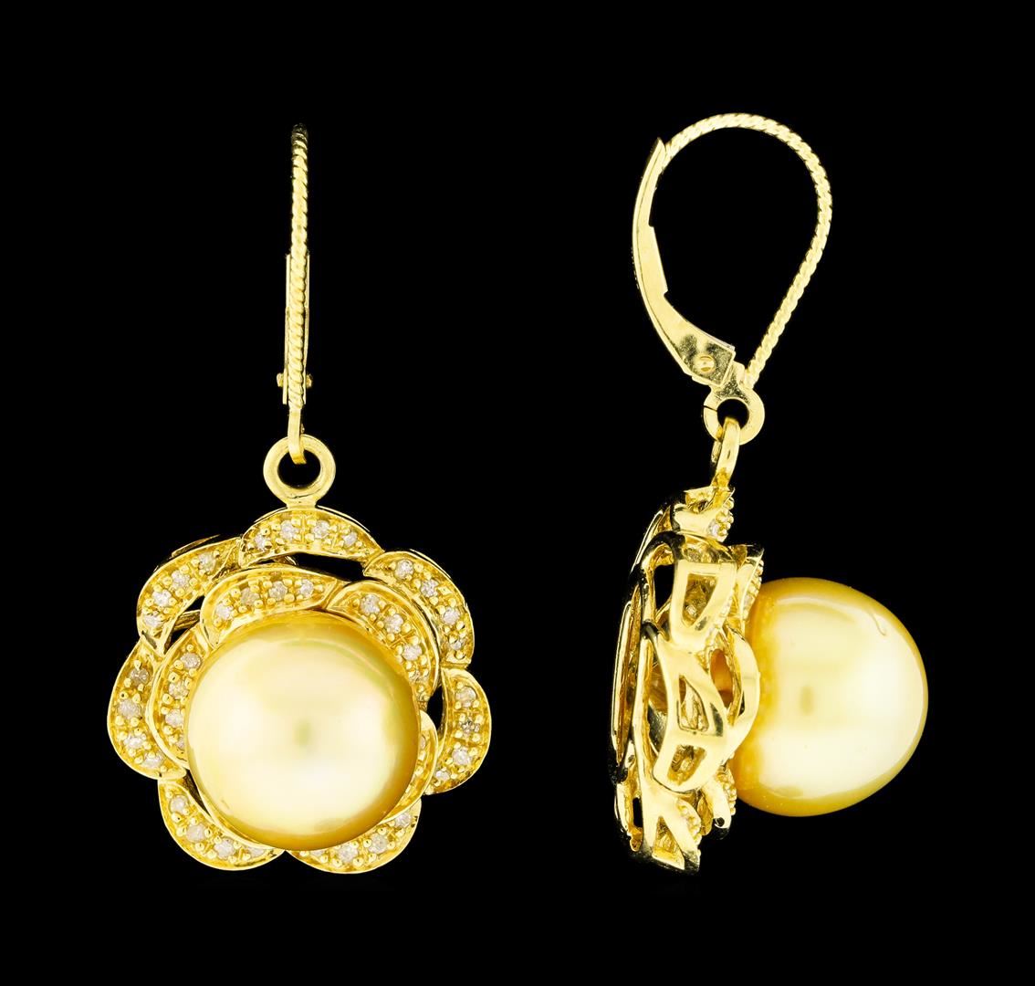 One suite electronically tested 14KT yellow with rhodium plating gold lady's combination cast & assembled fashion pendant and earrings with lever backs with a bright polish finish. Identified with markings of '14K'. Condition is new, good workmanship. Containing: Three south sea cultured pearls, 12.0mm to 11.8mm in size. The pearls are light golden in color with a good luster, round to near round, and clean with very good matching. Graded in the setting. One Hundred Ninety-Two prong set single cut diamonds, measuring 1.20 - 1.10 x 0.71mm (depth est.) approximate total weight of 192 Stones = 1.10ct. Graded in the setting. Clarity I-1 to I-3. Color: H - I Cut Good. Total Weight of Diamonds 1.10ct.. Total Weight of Pendant And Earrings 22.80gm. GAS Appraised at $8,325.00.