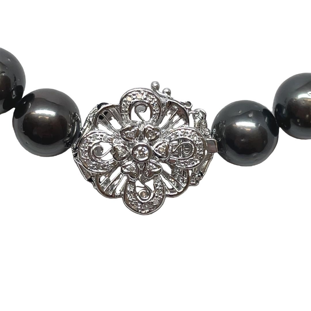 One graduated single strand pearl necklace 18.5" princess length, knotted with a tongue clasp & foldover safety containing 35 Tahitian pearls, 13.4mm to 11.0mm in size. The pearls are black in color, green overtone with a good luster, round to near round, and lightly blemished with very good matching. The featured pearl necklace has a 14KT white gold rounded floral motif clasp encrusted with diamonds. Graded on the strand.Tahitian cultured pearls form in the Pinctada Margaritifera oysters. This species is native to the central and South Pacific Ocean but is generally raised in lagoons by pearl farmers. Tahitian cultured pearls take between two to four years to form. One bezel set round brilliant cut diamond, measuring 2.30 - 2.25 x 1.41mm (depth est.) approximate weight of 0.05ct. Graded in the setting. Color H Clarity SI-1 Cut Very Good Thirty-Four prong set single cut diamonds, measuring 1.10 - 1.00 x 0.65mm (depth est.) approximate total weight of 34 Stones = 0.15ct. Graded in the setting. Color H - I Clarity SI-1 to I-1 Cut Good Total Weight of Diamonds 0.20ct. Total Weight of 91.50gm