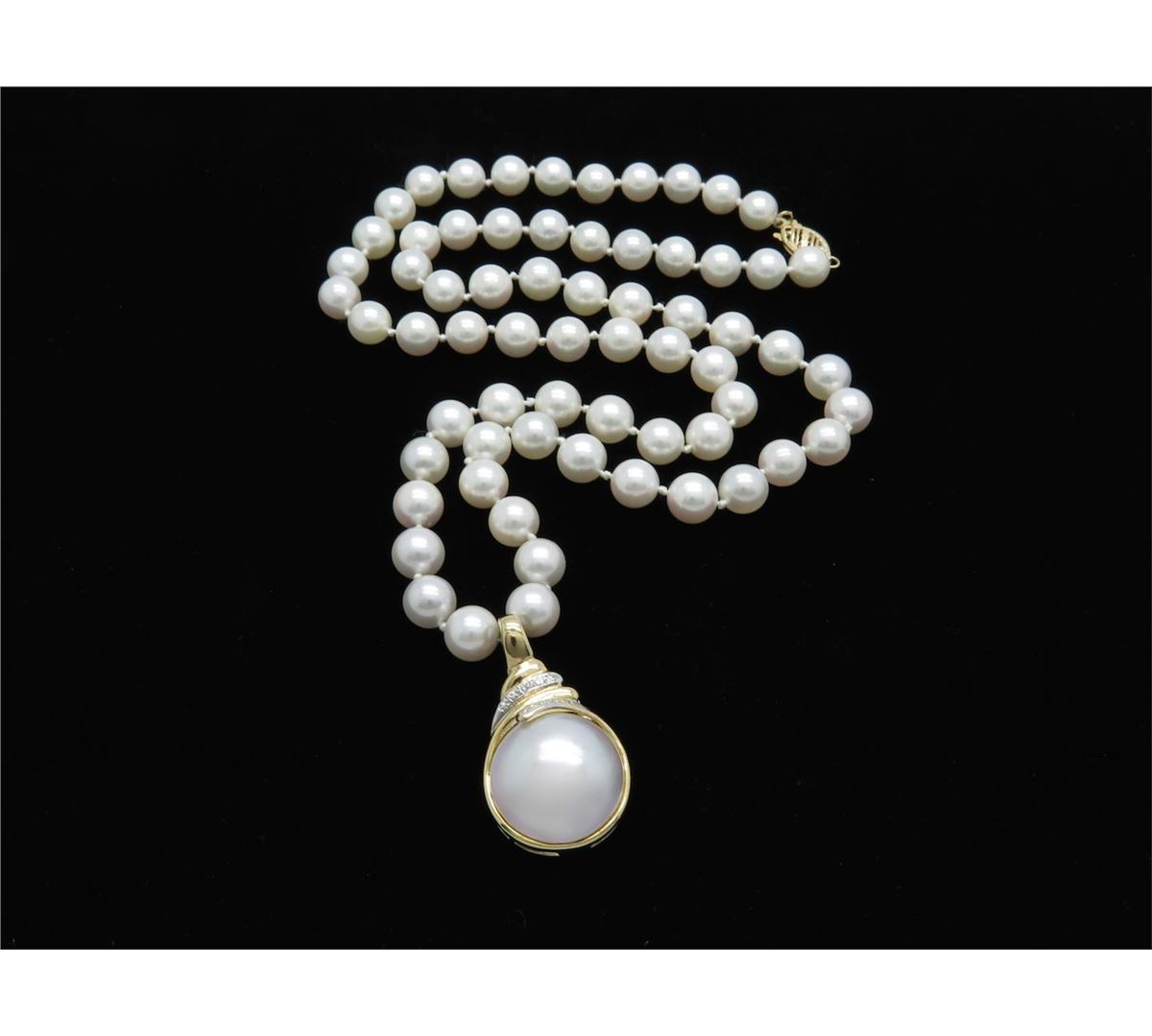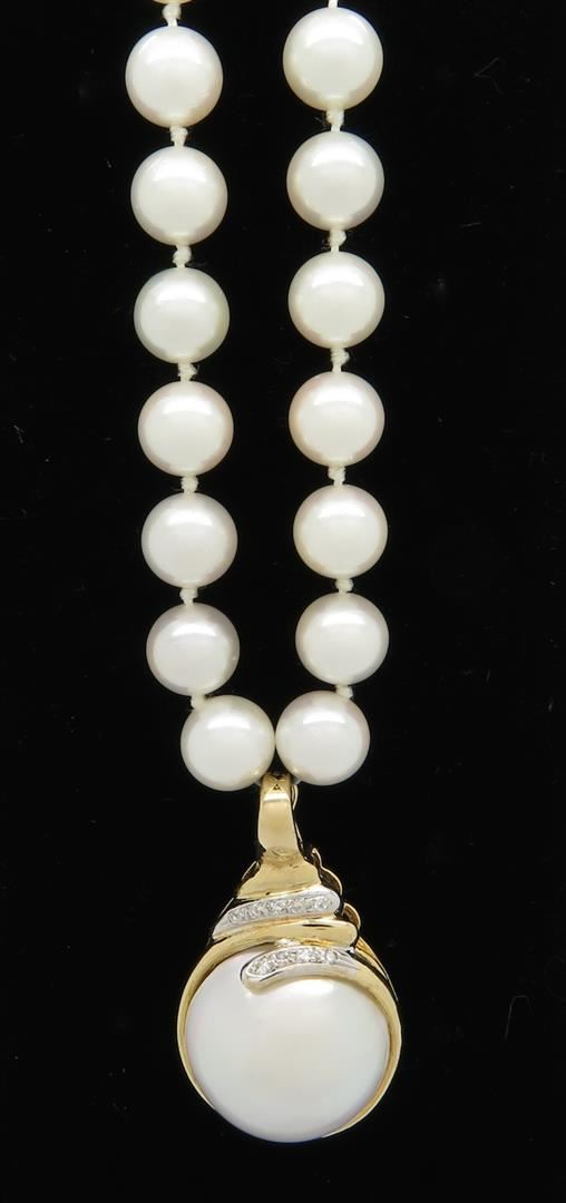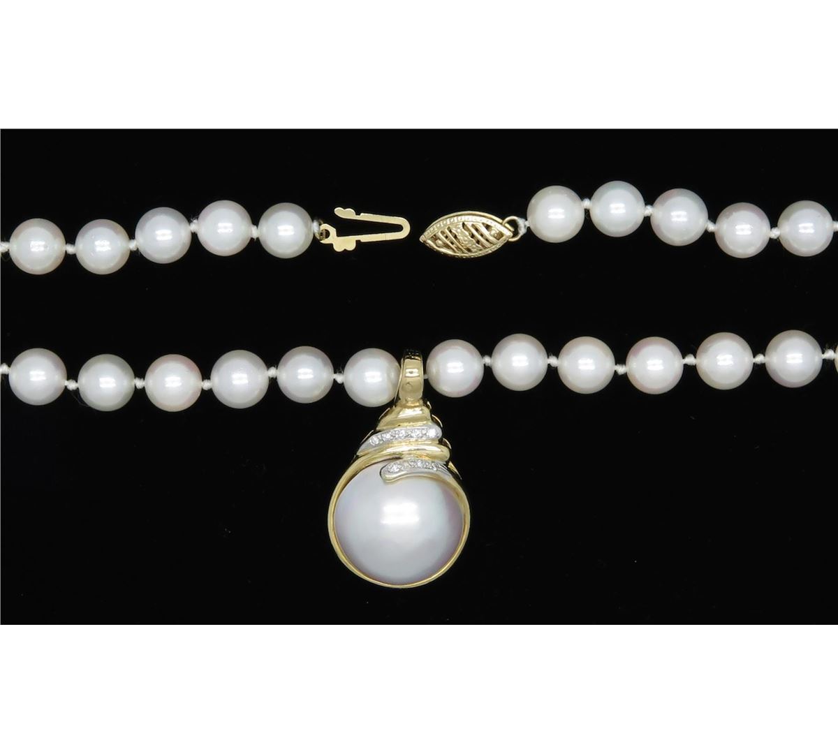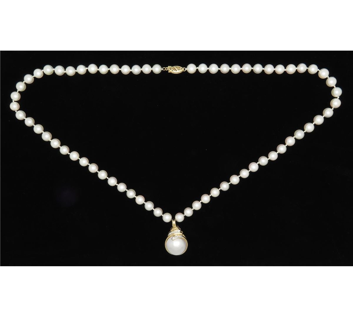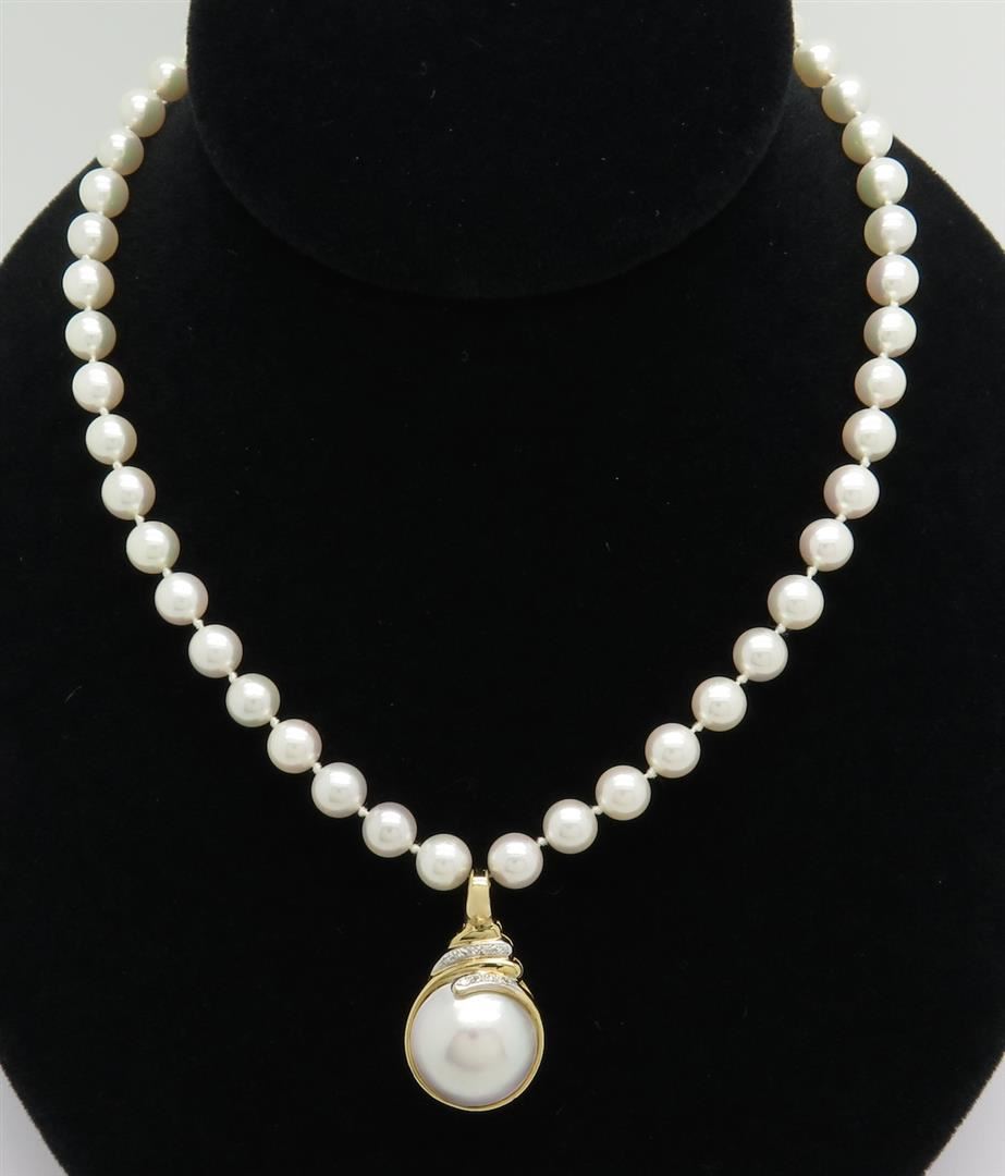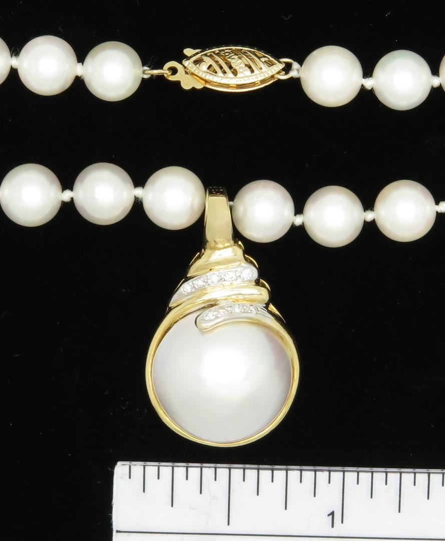 One tested 14K yellow gold pearl and diamond necklace. Containing: 9 Round Brilliant Cut Diamonds. Approximate total diamond weight: .04CTW. Weight: 34.9 grams, Length: 21".