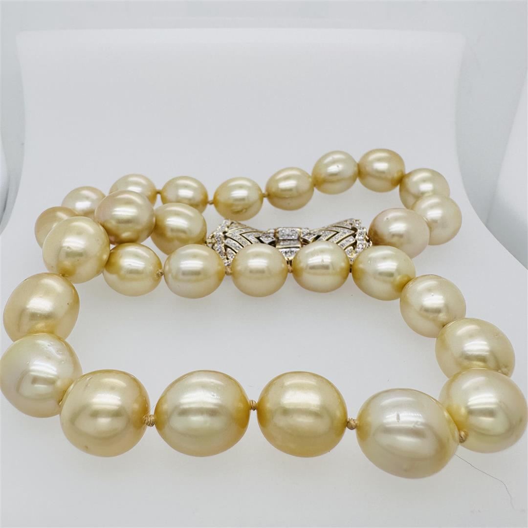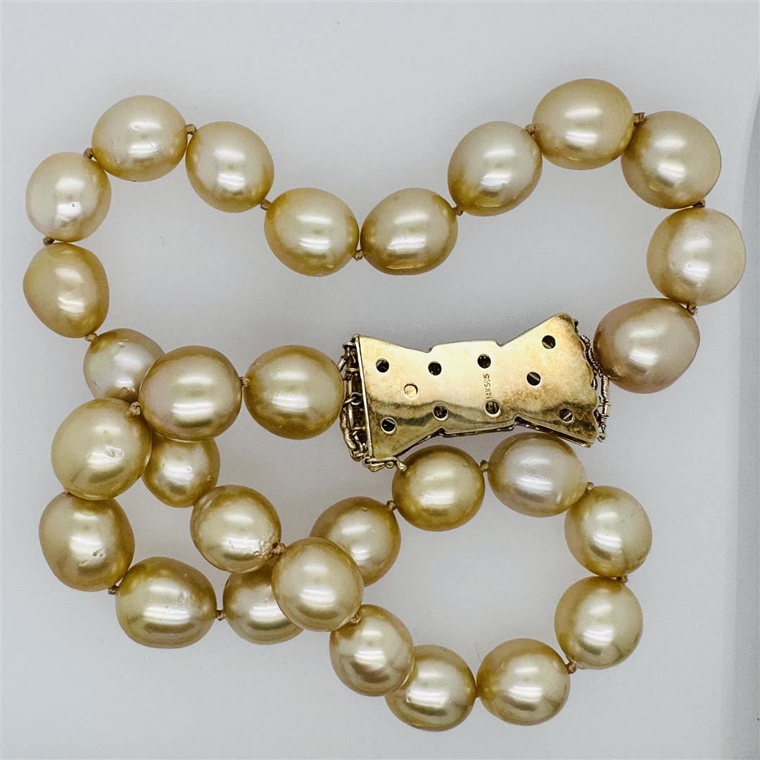One graduated single strand pearl necklace 18.5" princess length, knotted with a tongue clasp & foldover safety containing 29 south sea cultured pearls, 14.2mm to 12.1mm in size. The pearls are light golden in color with a very good luster, near round, and lightly blemished with very good matching. The featured pearl necklace has a 14KT yellow gold bow motif clasp encrusted with diamonds. Graded on the strand. South Sea cultured pearls are farmed in the oceans surrounding Australia, Indonesia, the Philippines and the southern coast of China. The main source of Australian South Sea pearls lies in the northwest on the Kimberly coast. South Sea cultured pearls are formed in the Pinctada Maxima oyster, which is the world's largest pearl cultivating oyster and is native to the South China Sea, the Java, the Indian and the Pacific Oceans. There are two varieties of the Pinctada Maxima oyster: the Gold Lipped oyster which produces golden colored pearls, and the Silver Lipped oyster which produces white colored pearls. These pearls take between two to three years to grow and have a unique nacre due to the fast moving and clean waters of the South Seas. Two prong set round brilliant cut diamonds, measuring 2.00 -1.95 x 1.23mm (depth est.) approximate total weight of 2 Stones = 0.06ct. Color of IJ, clarity of SI-1 to SI-2, cut is very good. Graded in the setting. One hundred thirty-two prong set single cut diamonds, measuring 1.10 1,00 x 0.65mm (depth est.) approximate total weight of 132 Stones = 0.60ct. Color of H-I, clarity of SI-1 to I-1, cut is good. Graded in the setting. Total Weight of Diamonds Total Weight of Total Estimated Retail Value 0.66ct. 110.00gm $ 26620.00